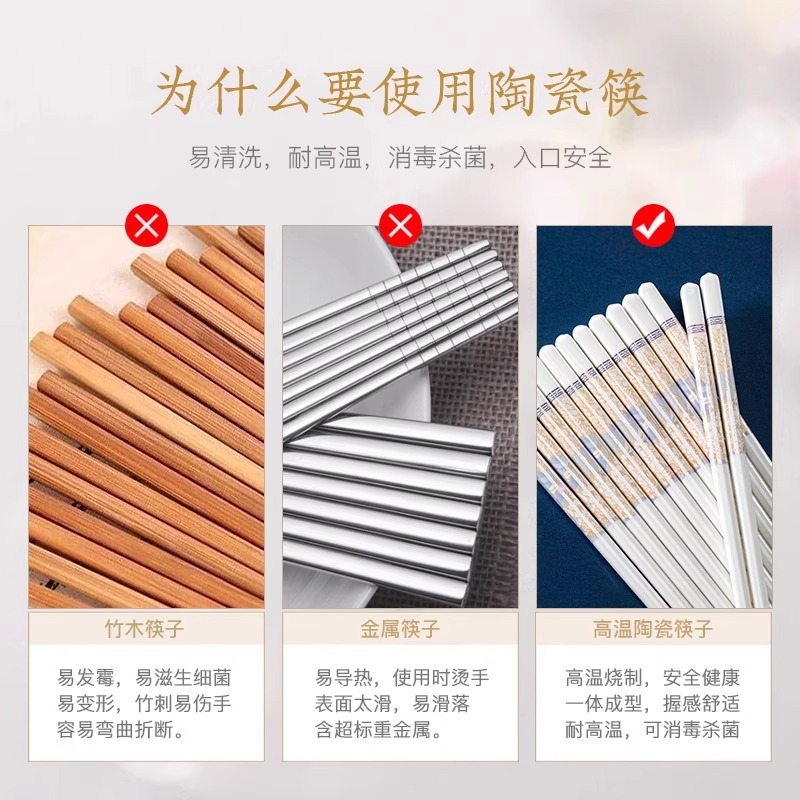 纯陶瓷筷子景德镇正品 防滑家用抗菌耐高温防霉筷食品级优质高档