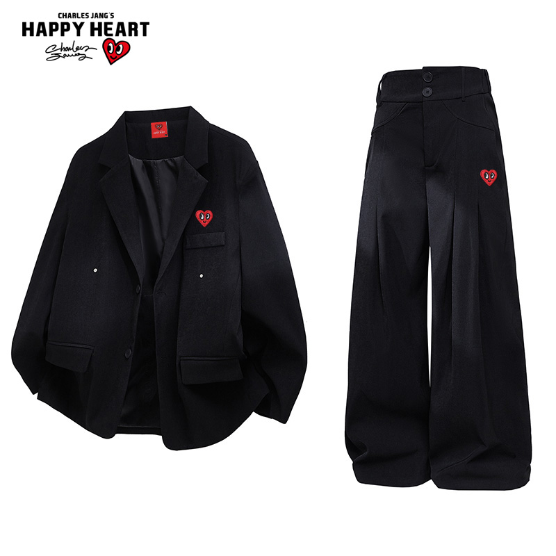 美式 学院风外套休闲直筒长裤 西装 男2025年春秋季 套装 查尔斯桃心
