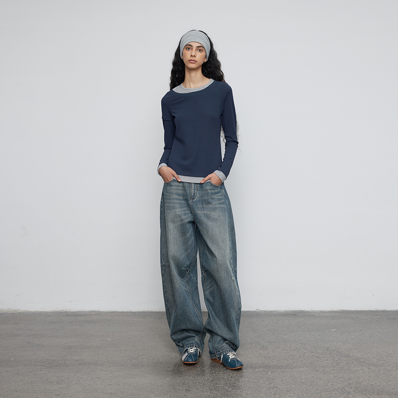 宽松休闲不对称假两件撞色t恤女长袖 2025秋季 运动 半圆原创女装