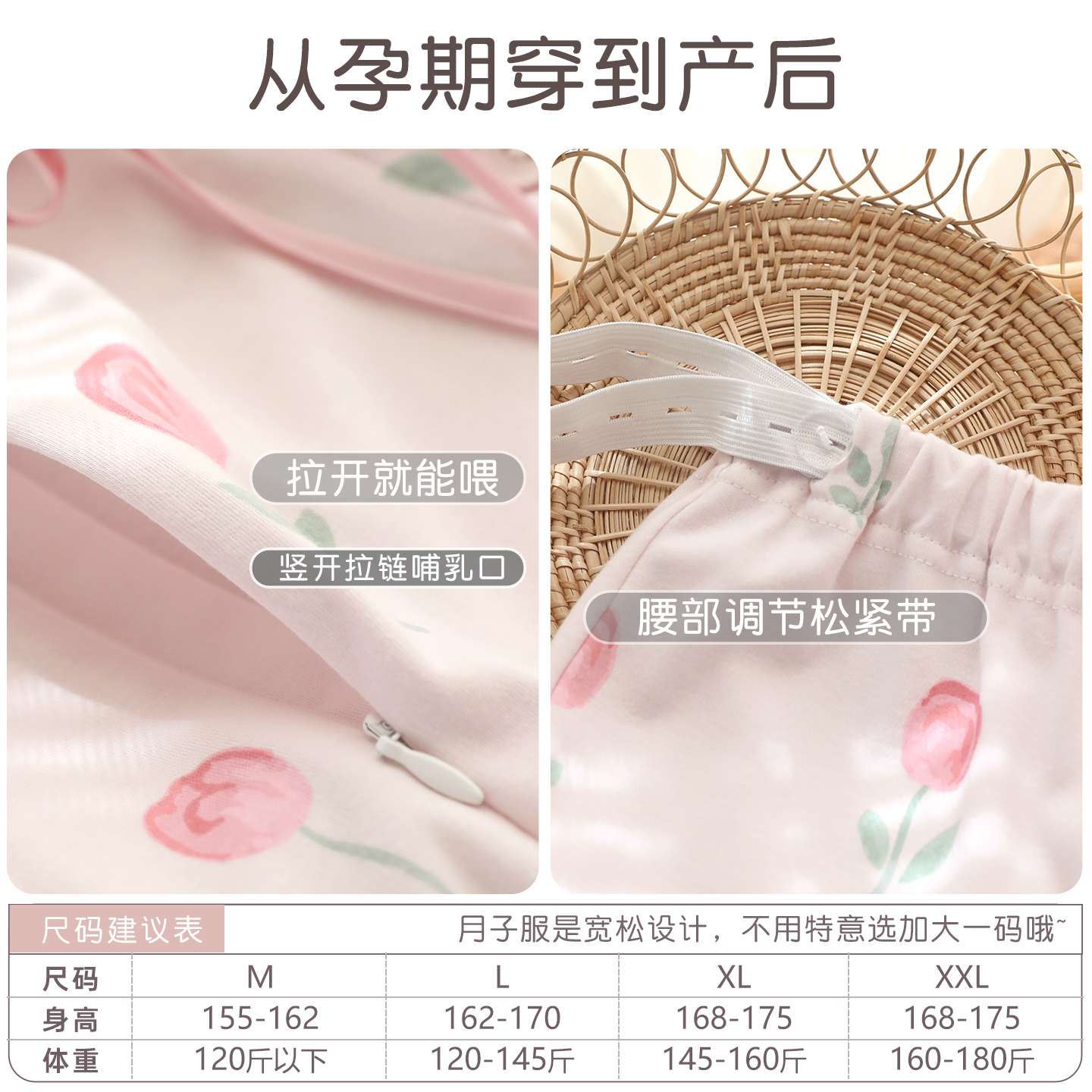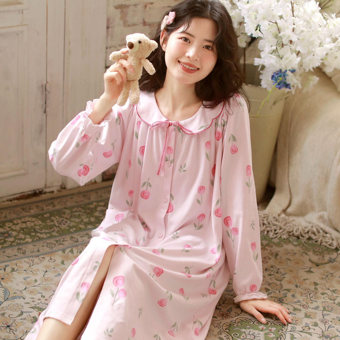 带胸垫 产后哺乳裙孕妇医院待产裙 富朵春秋月子服睡裙针织棉长袖