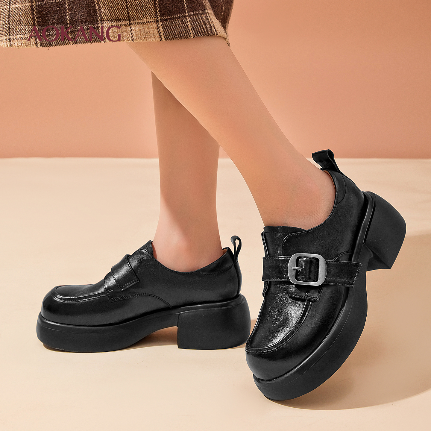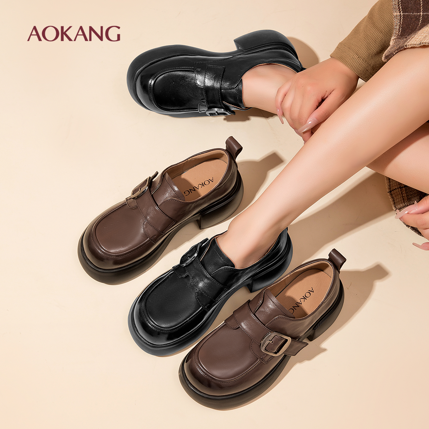 女鞋 厚底增高英伦复古高档皮鞋 2025秋季 真皮粗跟乐福鞋 新款 奥康