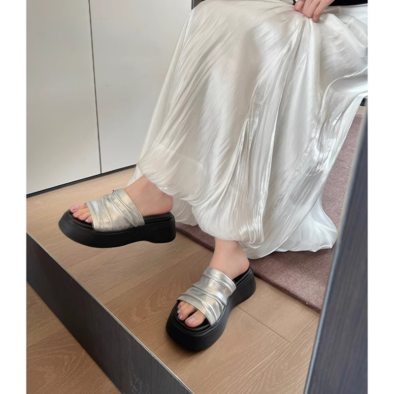 平底沙滩鞋 舒适增高厚底拖鞋 褶皱一字拖凉拖鞋 夏季 女外穿2025新款