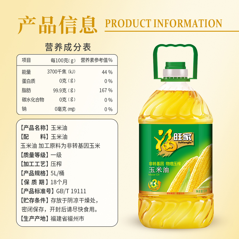 福旺家玉米油5L非转基因物理压榨健康油家用优选 保证新鲜日期