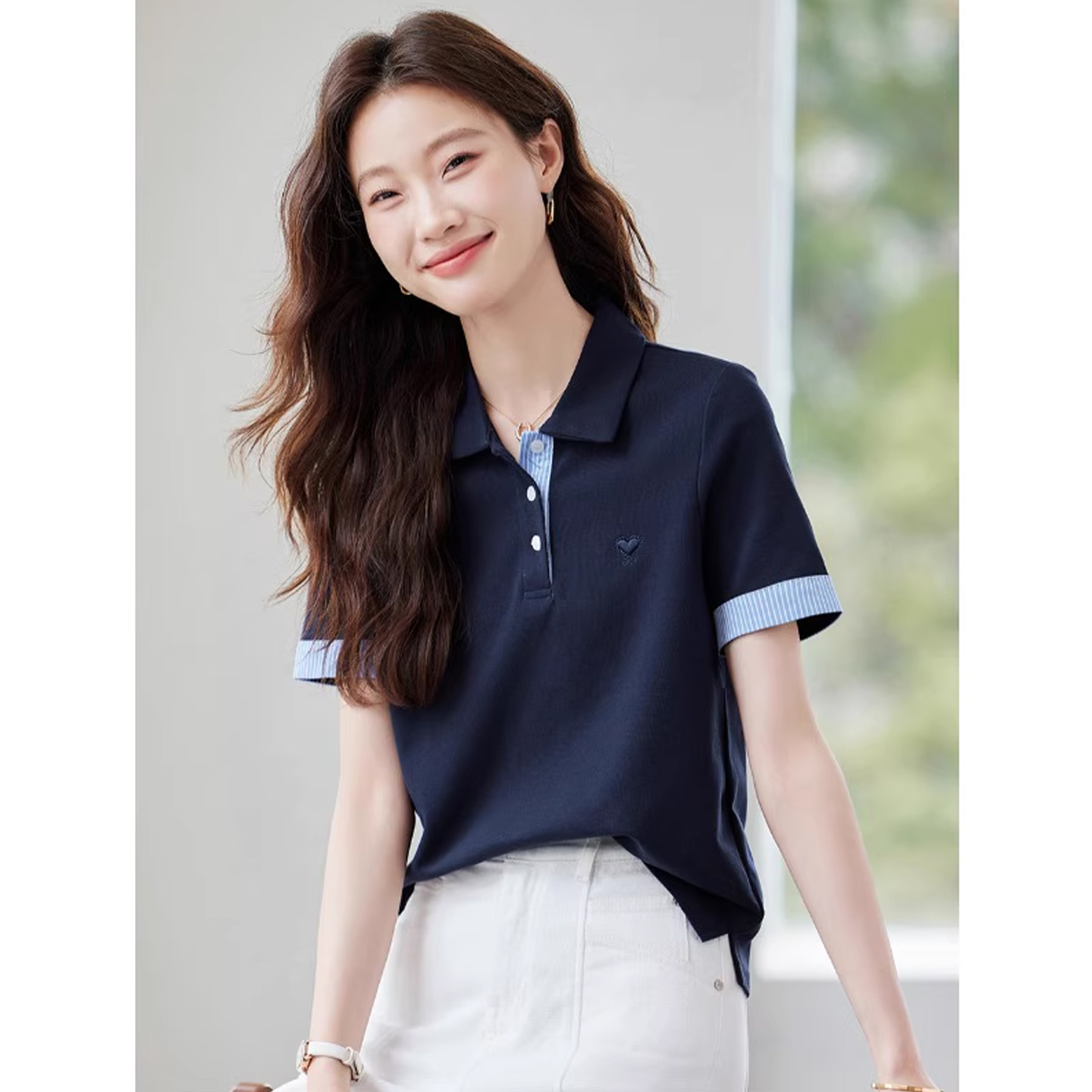 t恤女2025夏季 polo衫 新款 刺绣撞色翻袖 宽松显瘦正肩上衣 韩版 短袖