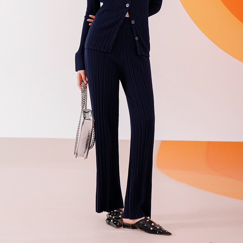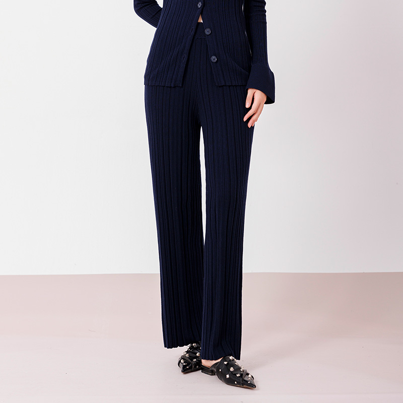 松紧腰条纹直筒裤 肌理感针织休闲长裤 女eahchanie 新款 奕辰秋季