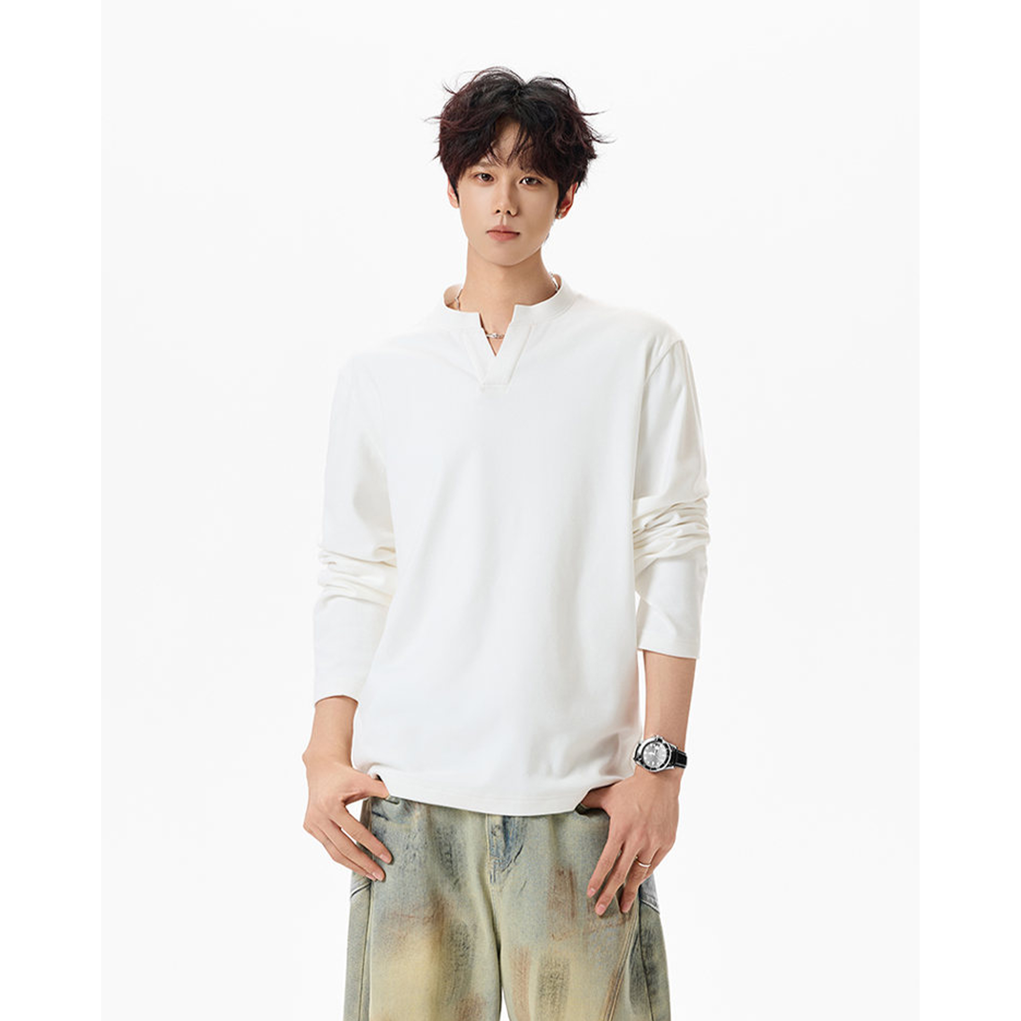 亨利领宽松百搭情侣打底衫 T恤男女秋季 上衣 简约小V领纯色长袖 美式