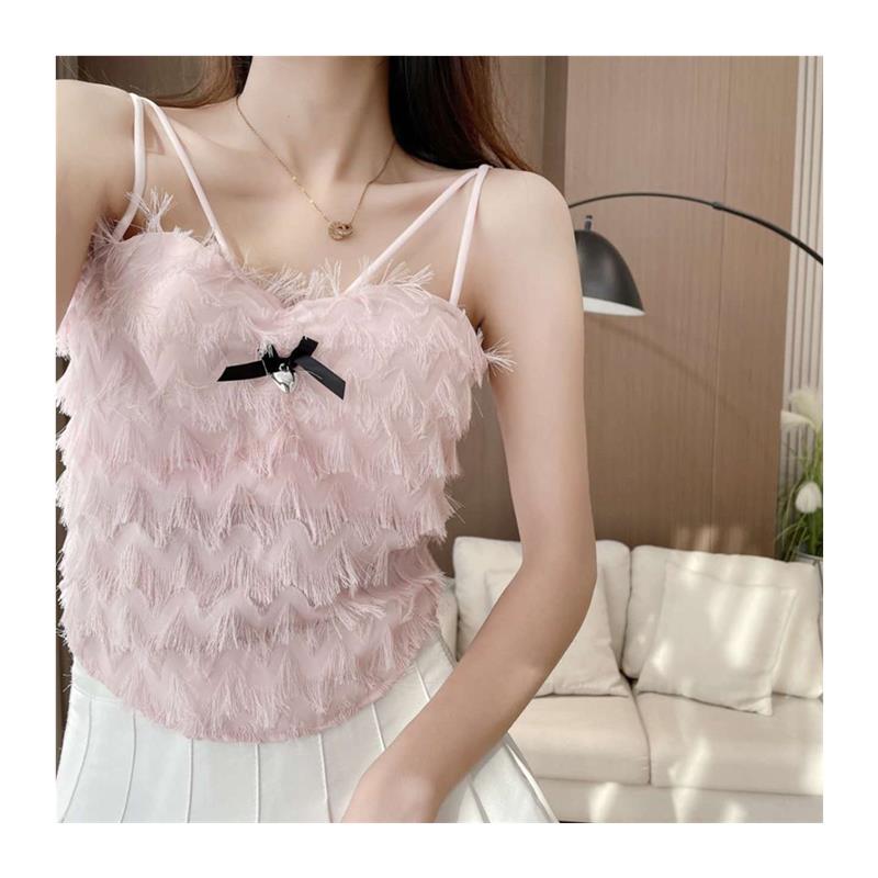 新品 辣妹甜美毛绒流苏蝴蝶结吊带背心女带胸垫褶皱美背外穿设计感
