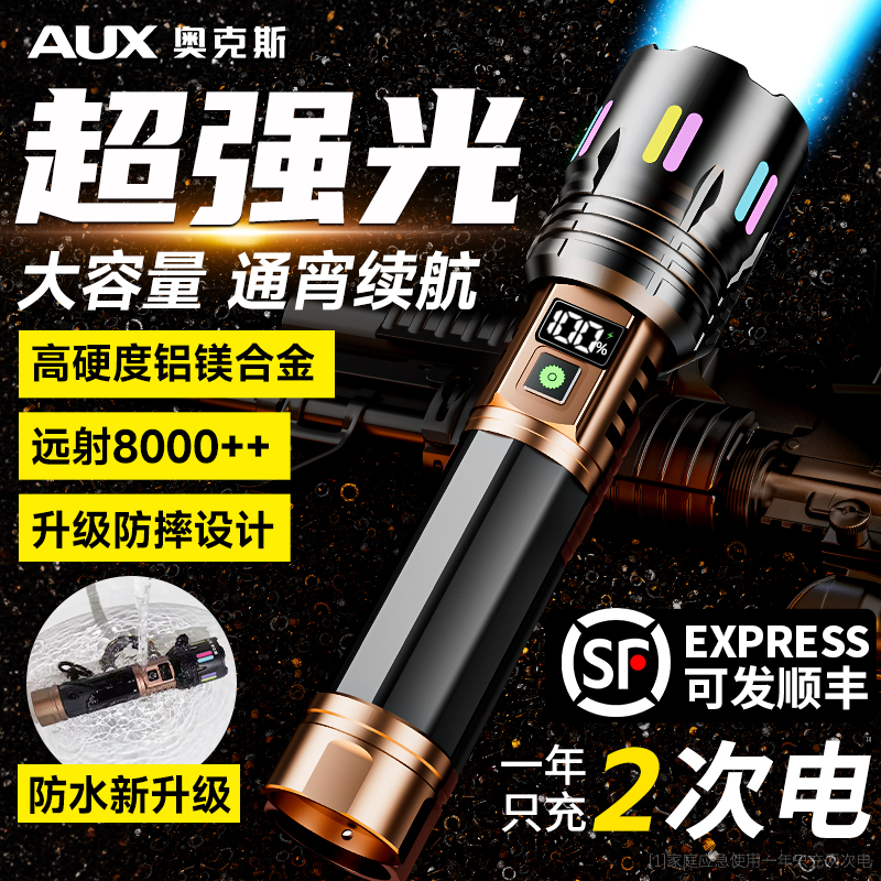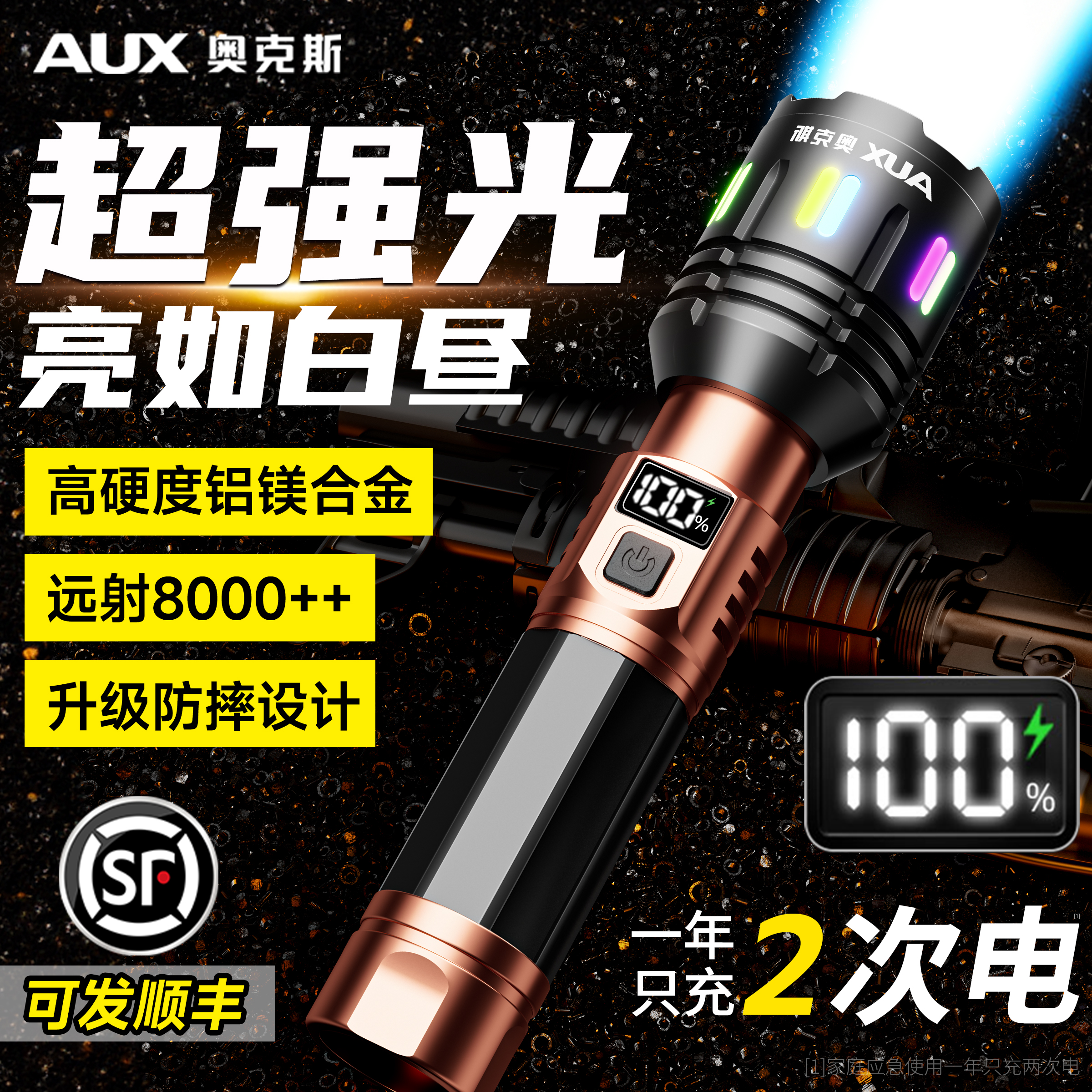 奥克斯手电筒强光充电超亮户外远射大功率超长续航大容量家用新款