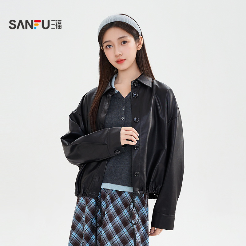 小个子翻领宽松夹克上衣女装 时尚 507135 秋季 三福皮衣外套2025新款