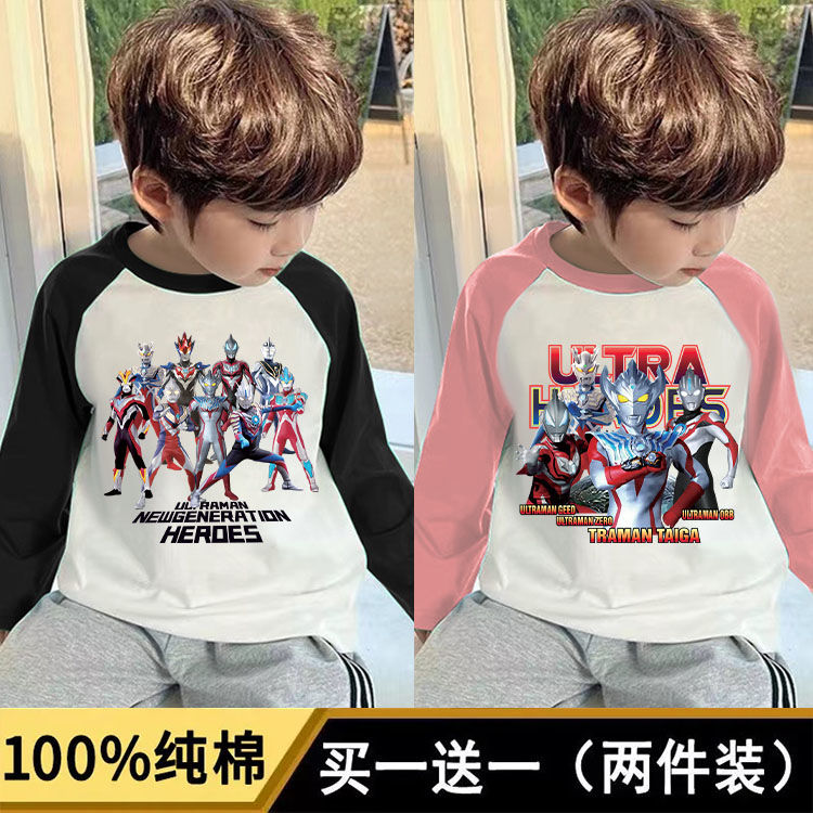卡通拼接插肩打底衫 100%纯棉男童奥特曼长袖 男孩新款 新款 t恤秋装