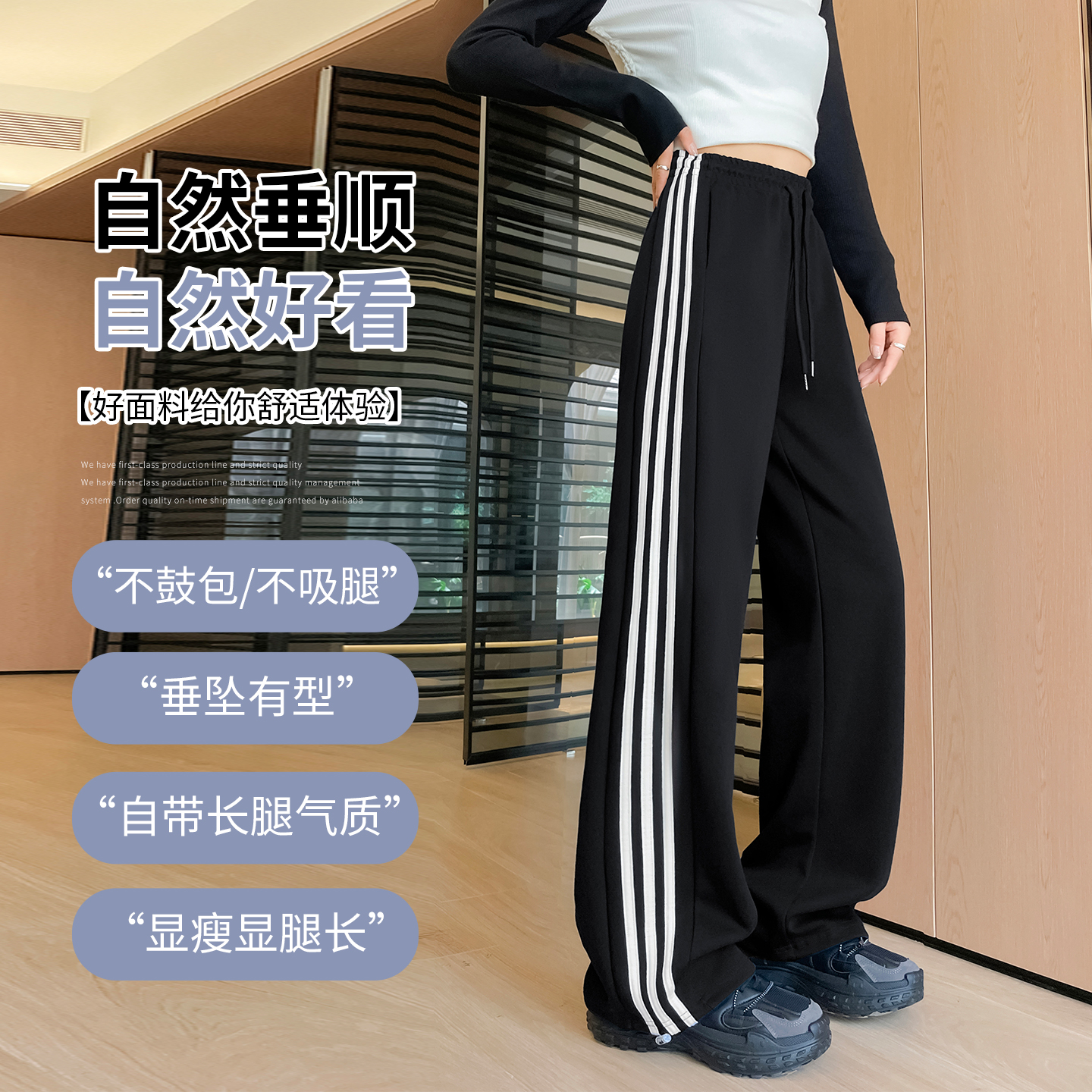宽松垂感休闲条纹束脚卫裤 运动裤 藏蓝色阔腿裤 春秋季 子 女2025新款