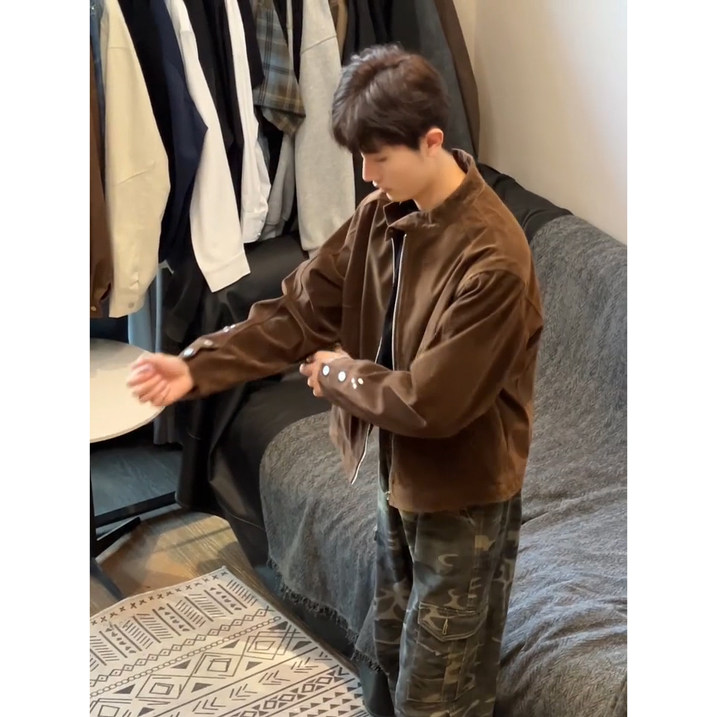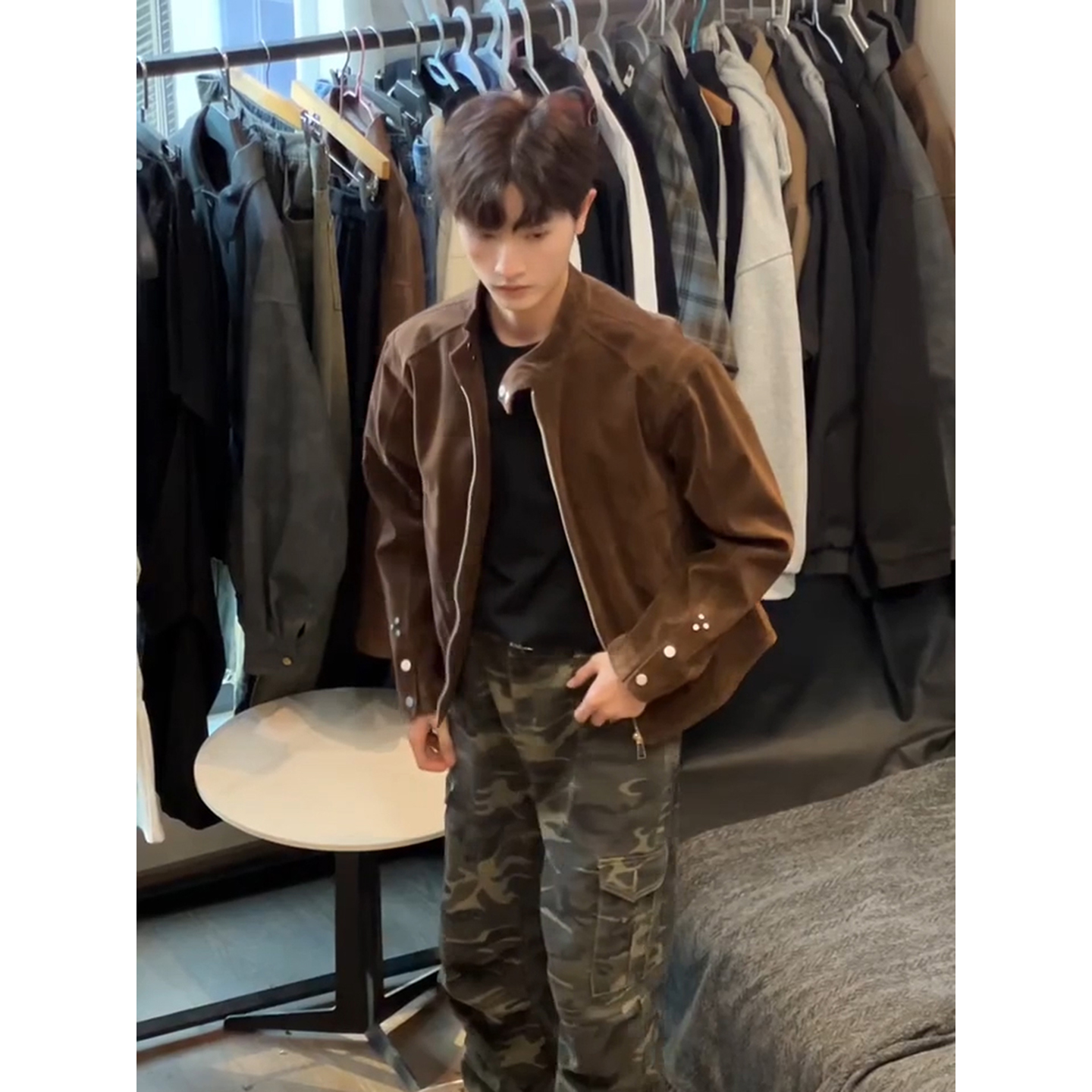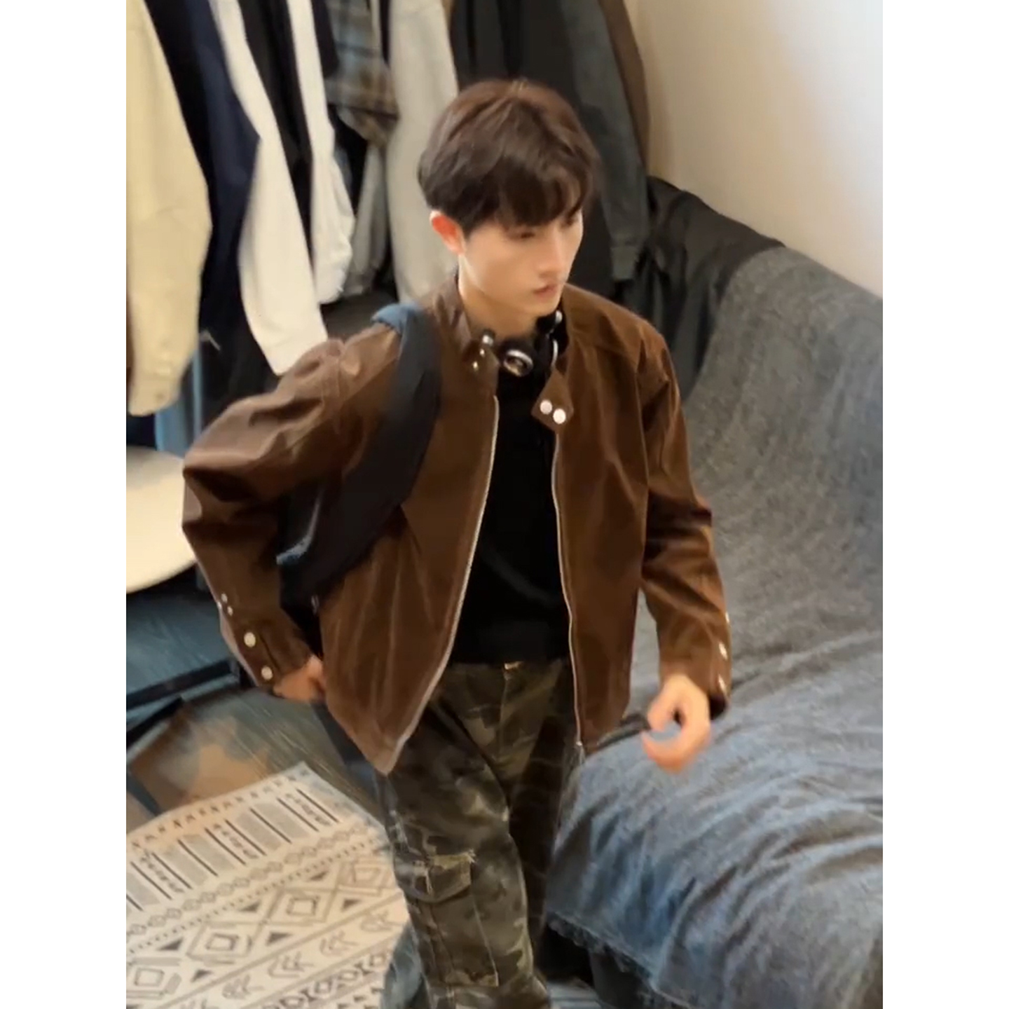 美拉德皮衣外套男秋季 痞帅铆钉立领夹克琥珀流光风穿搭棒球服 美式