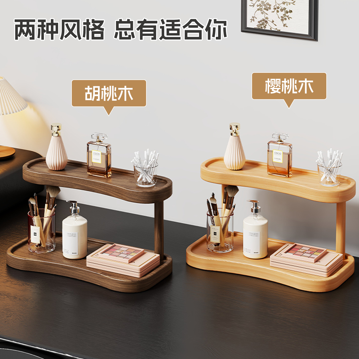 实木桌面化妆品收纳架家用卫生间双层中古风香水香薰储物整理托盘