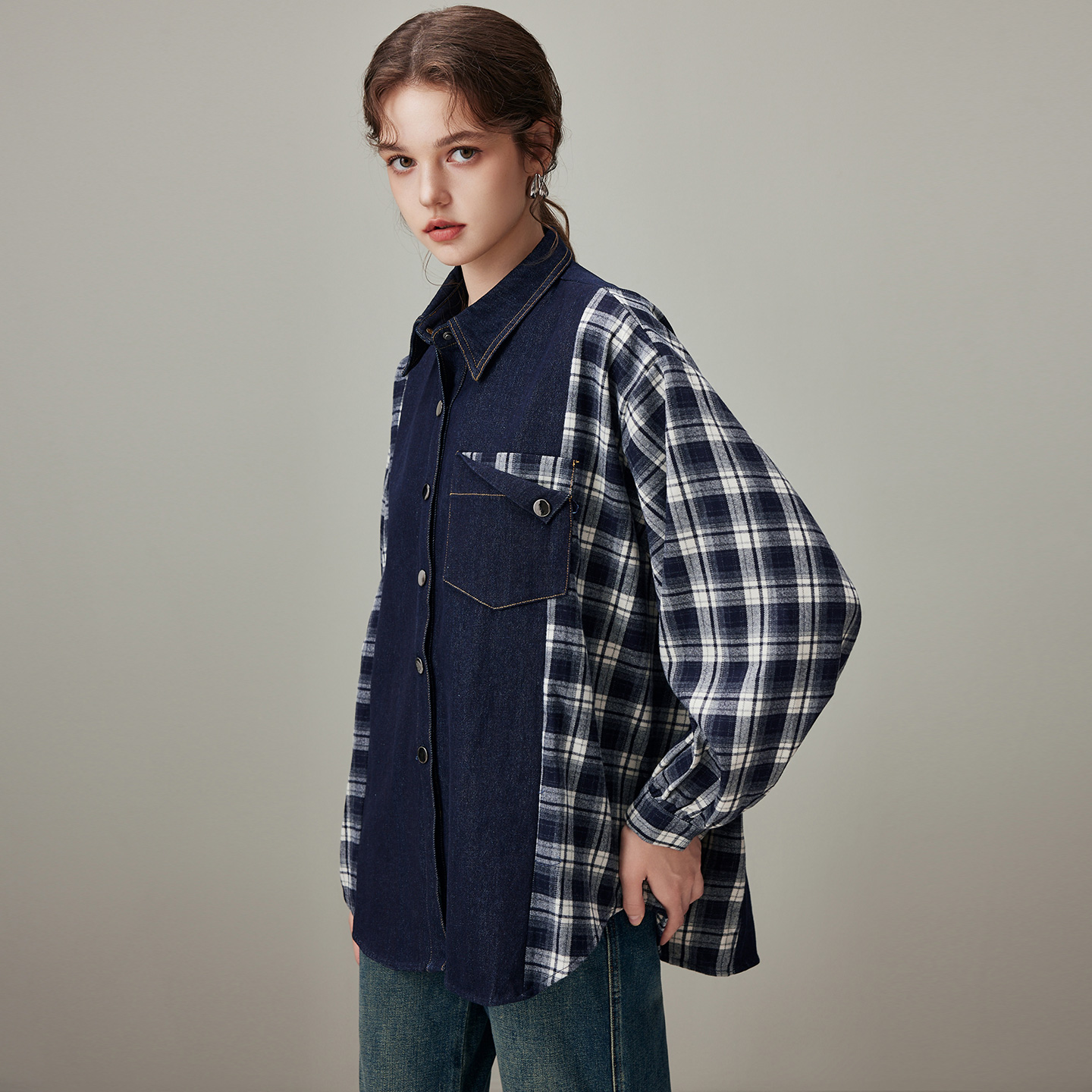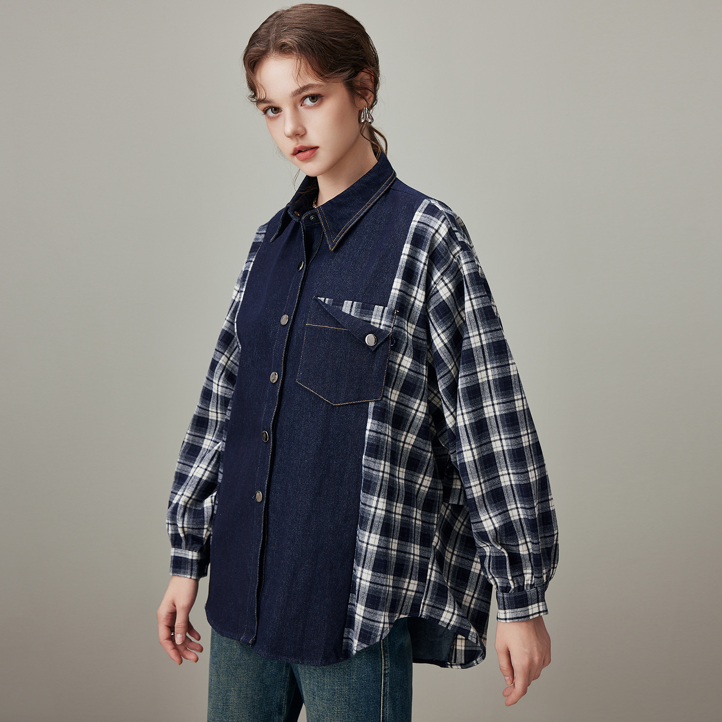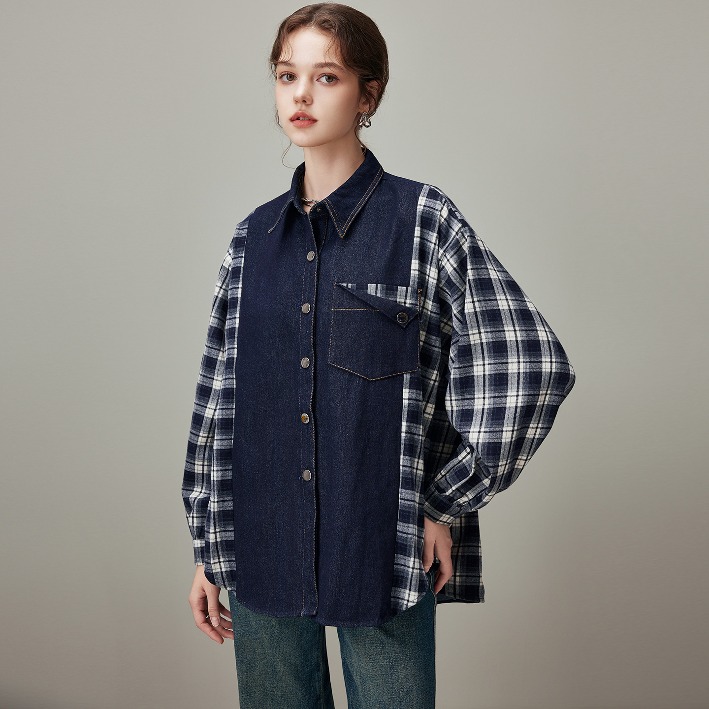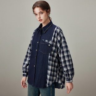 新款 dfvc韩版 女2025年秋季 衬衫 拼接宽松中长上衣 牛仔拼接格子长袖