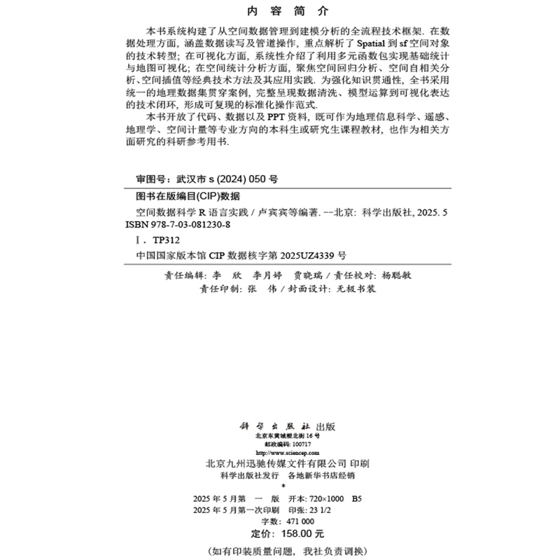 乐鹏 董冠鹏 秦昆 现货速发 科学出版 卢宾宾 主编 社9787030812308 空间数据科学R语言实践