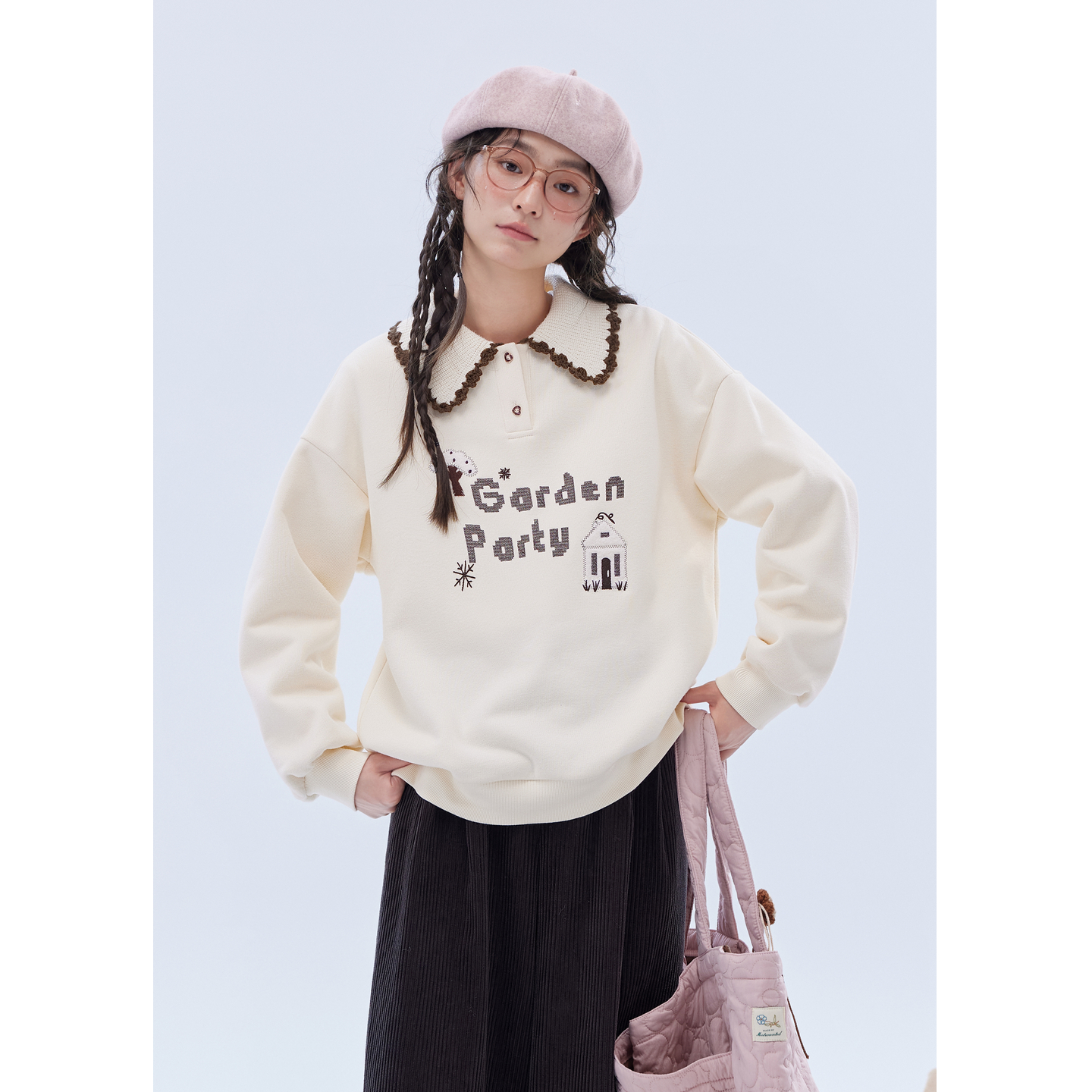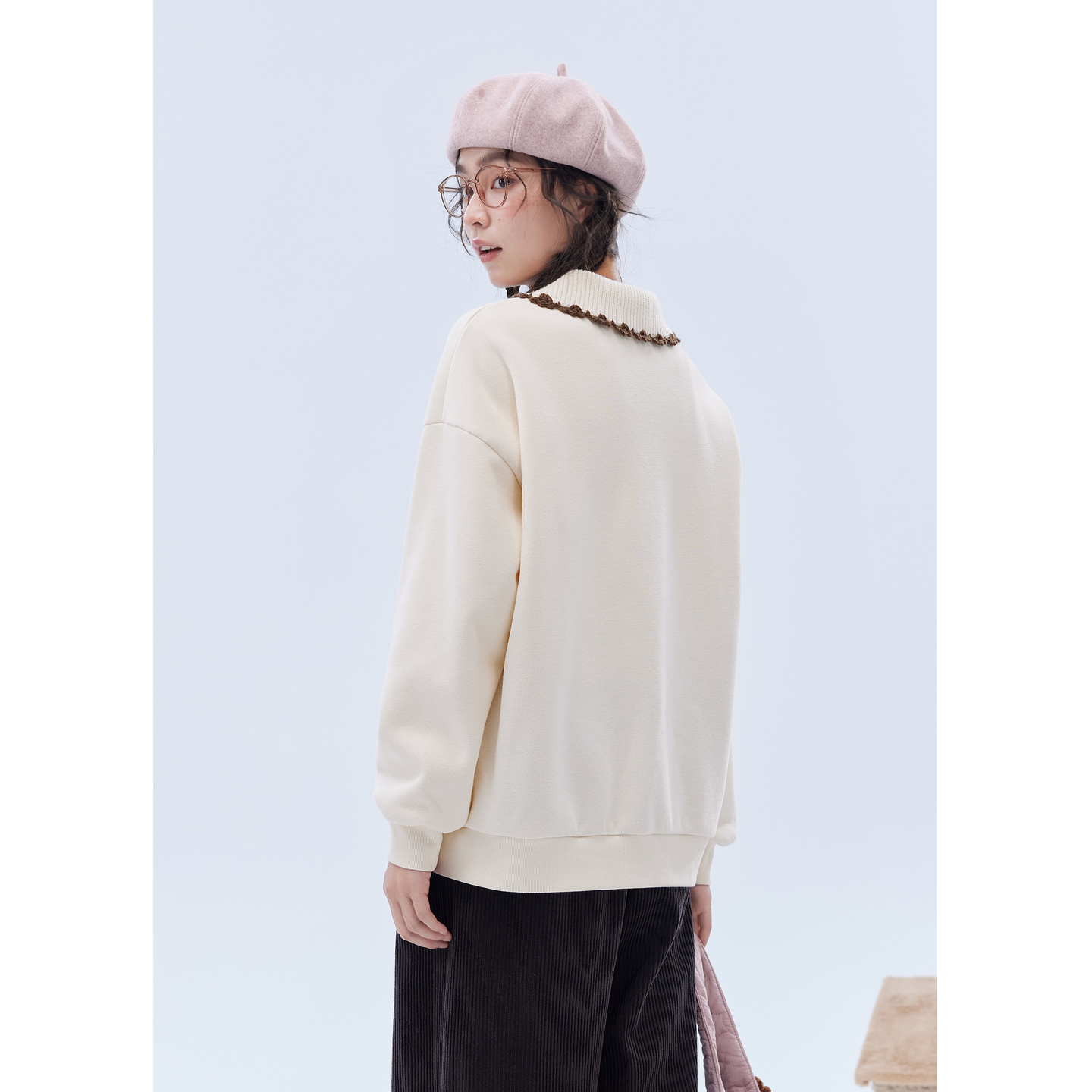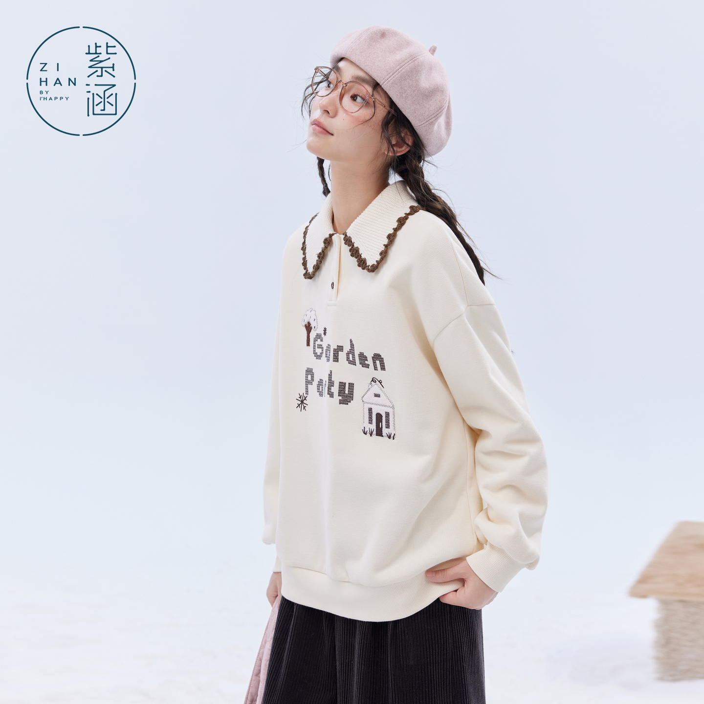 紫涵撞色花边POLO领卫衣女2025冬季 甜美贴布刺绣宽松套头上衣 新款
