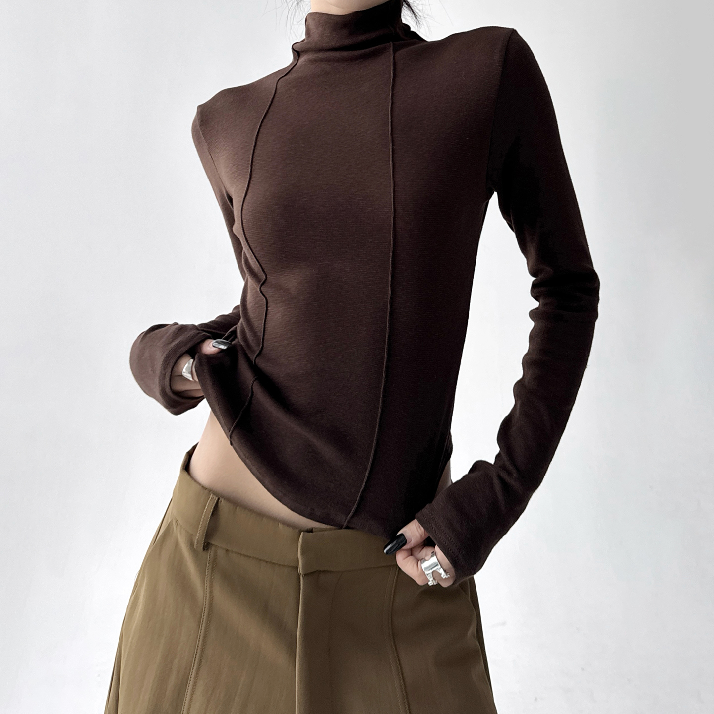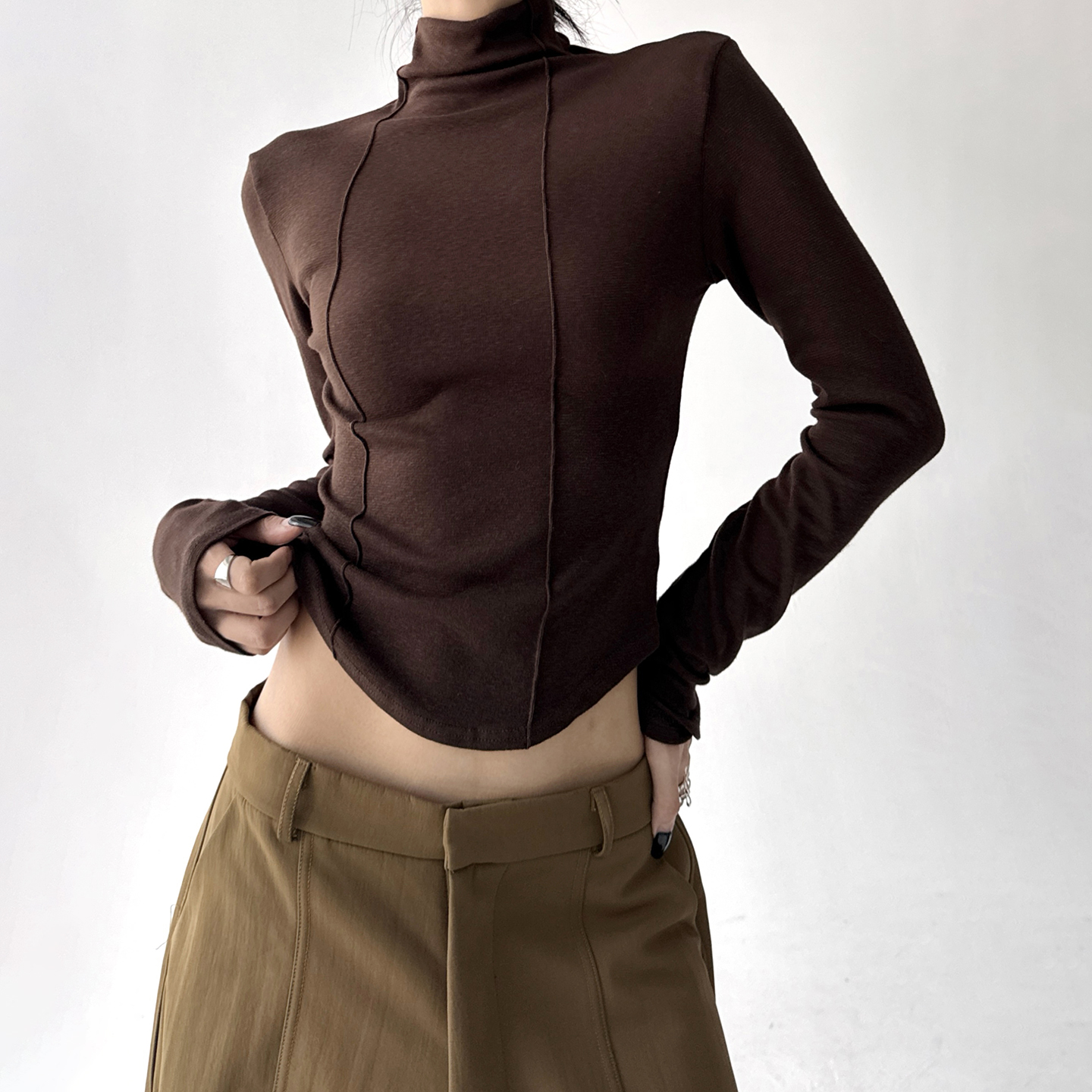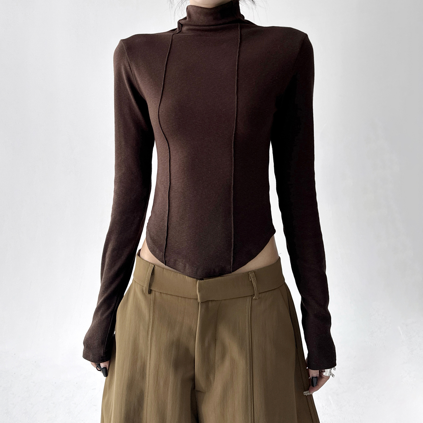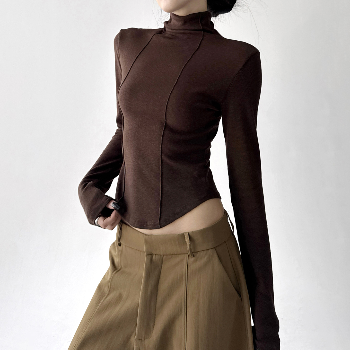 别致漂亮小衫 原创设计感长袖 堆堆领竖道修身 新款 T恤女2025春秋季