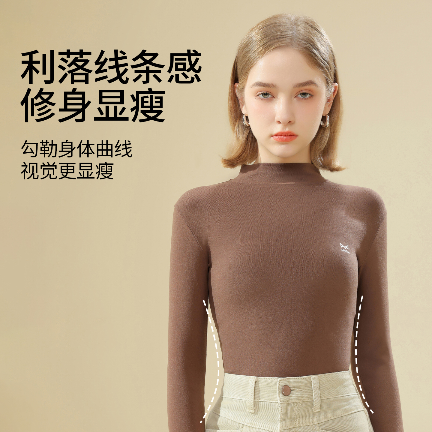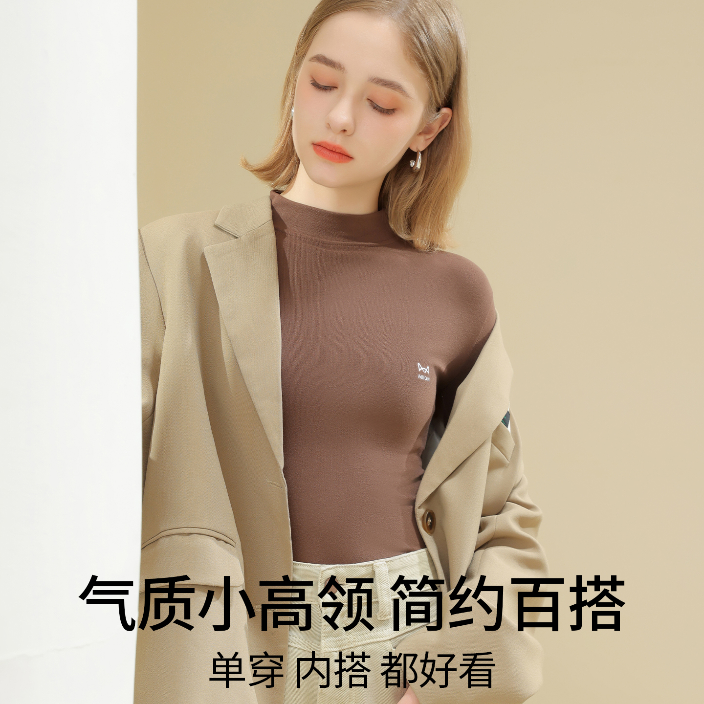 磨毛内搭保暖上衣女外穿长袖 发热薄款 秋衣 女秋季 猫人中领打底衫