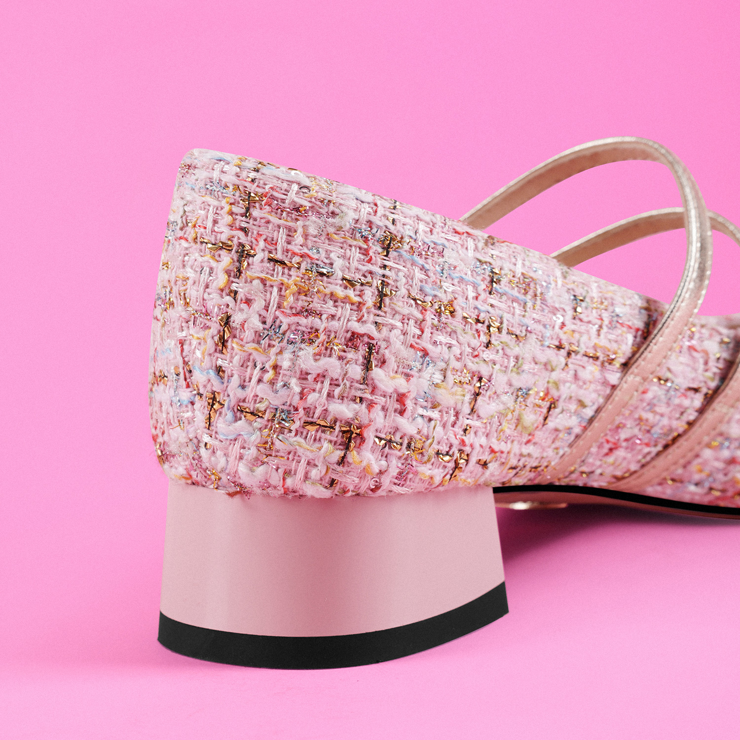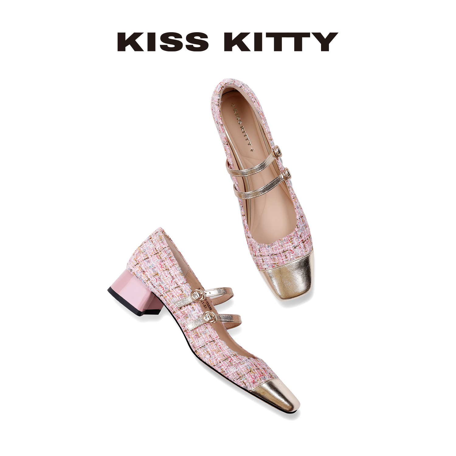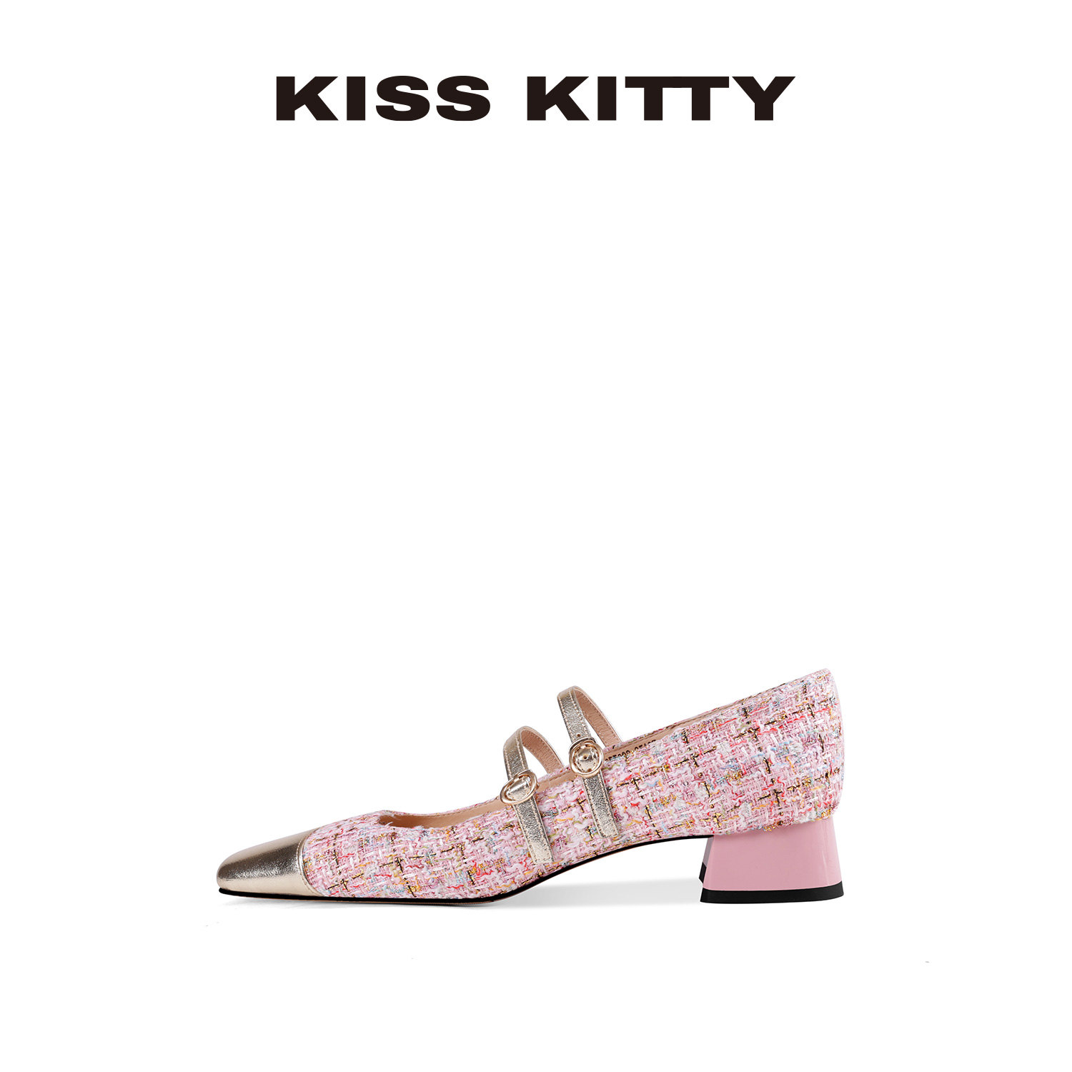 绝美巨好看 拼接方头低跟粉色法式 KISSKITTY玛丽珍单鞋 女2025新款
