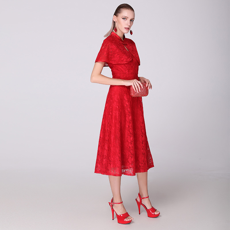 专柜正品 秋冬红色蕾丝绣花连衣裙子婚庆喜婆婆礼裙气质 马天奴女装