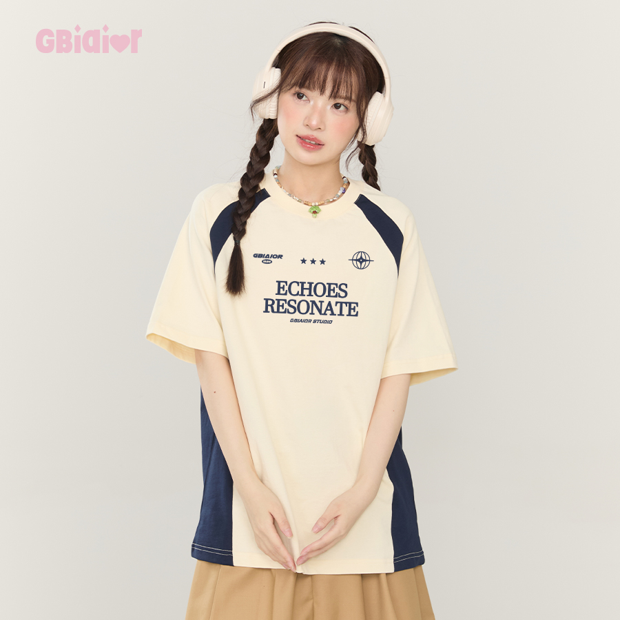 上衣 夏季 Gbiaior美潮复古学院风设计感休闲圆领短袖 t恤女潮牌美式