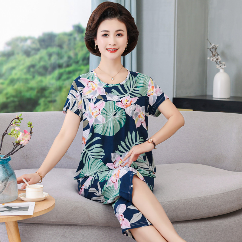 可外穿妈妈家居服大码 2025新款 薄款 冰丝短袖 棉绸睡衣女款 套装 夏季