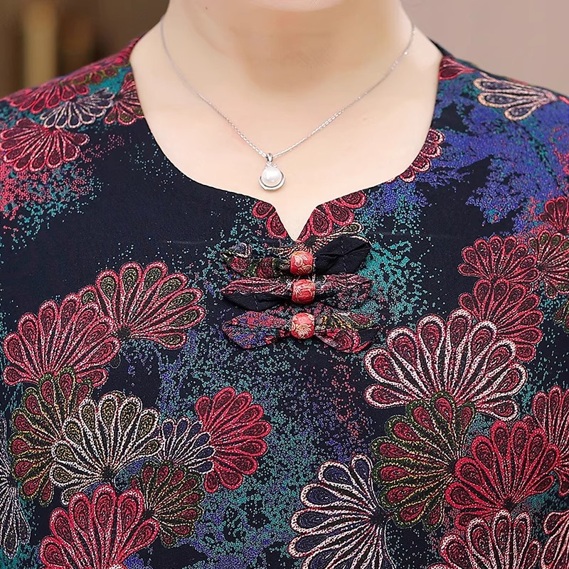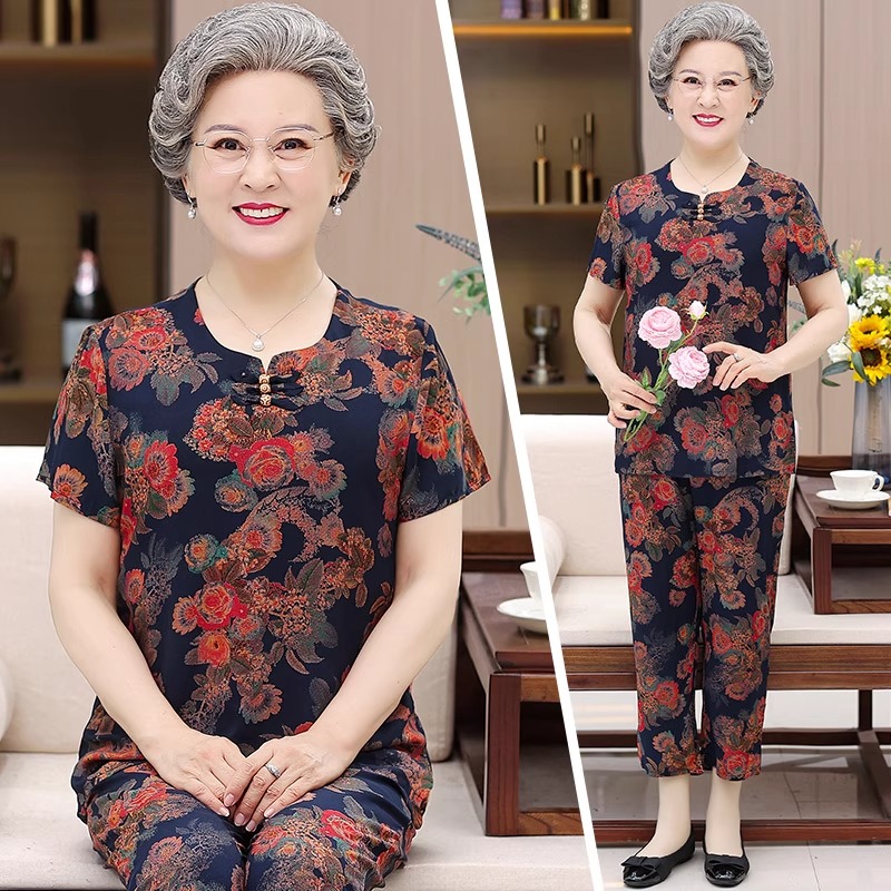 T恤棉绸套装 妈妈短袖 两件套太太老人衣服60岁70奶奶装 老年人夏装