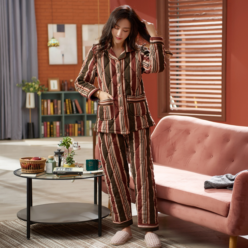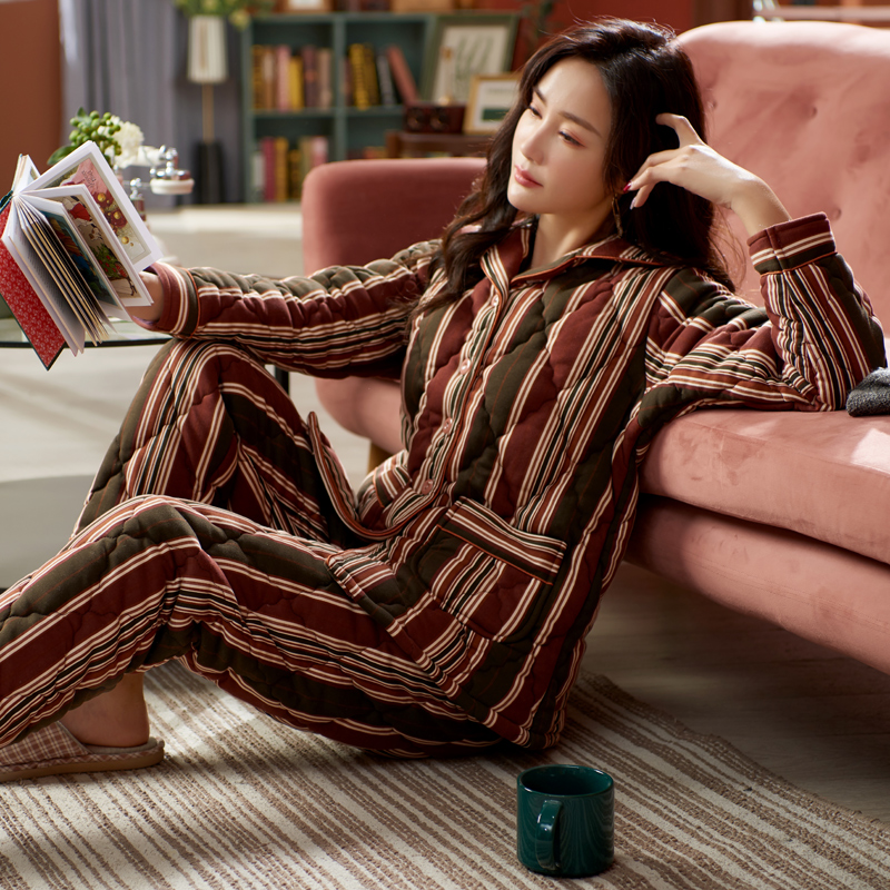 睡衣女秋冬季 加厚纯棉条纹可外穿夹棉袄三层保暖高级感家居服套装
