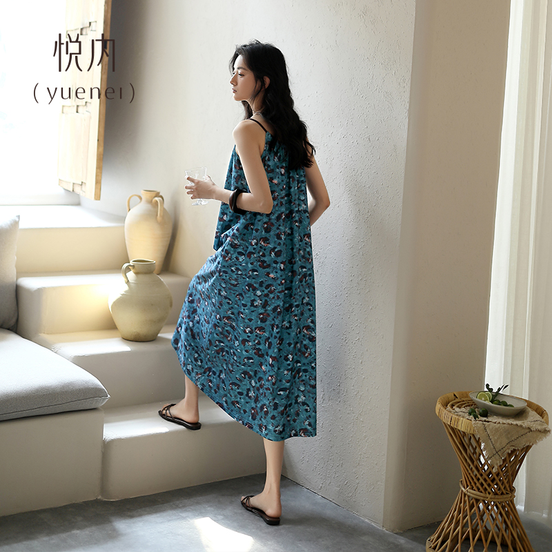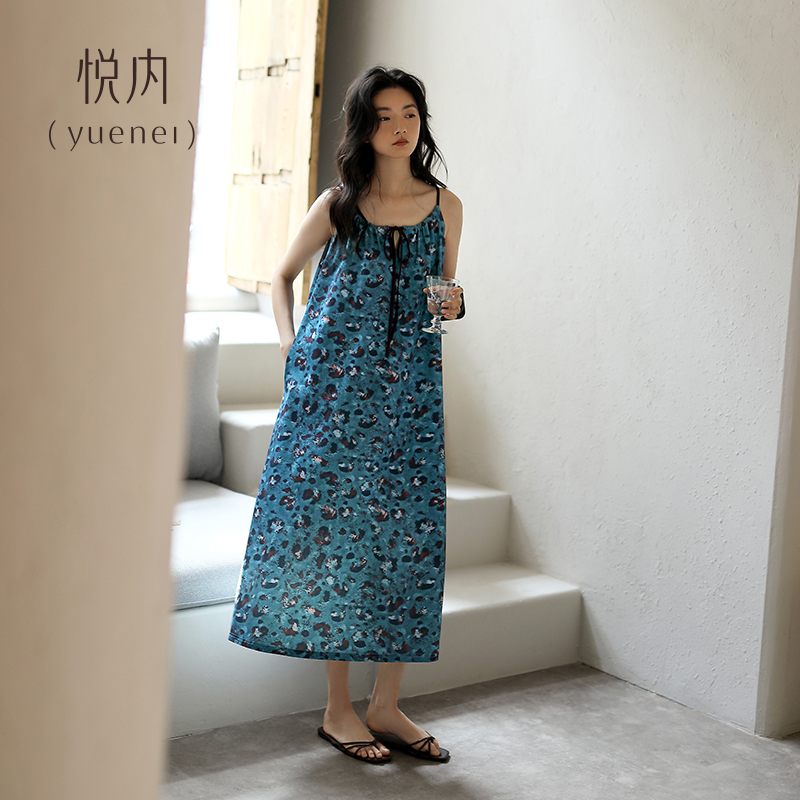 花青蓝长裙连衣裙 背心大码 悦内睡裙女士睡衣夏季 夏天纯棉吊带无袖