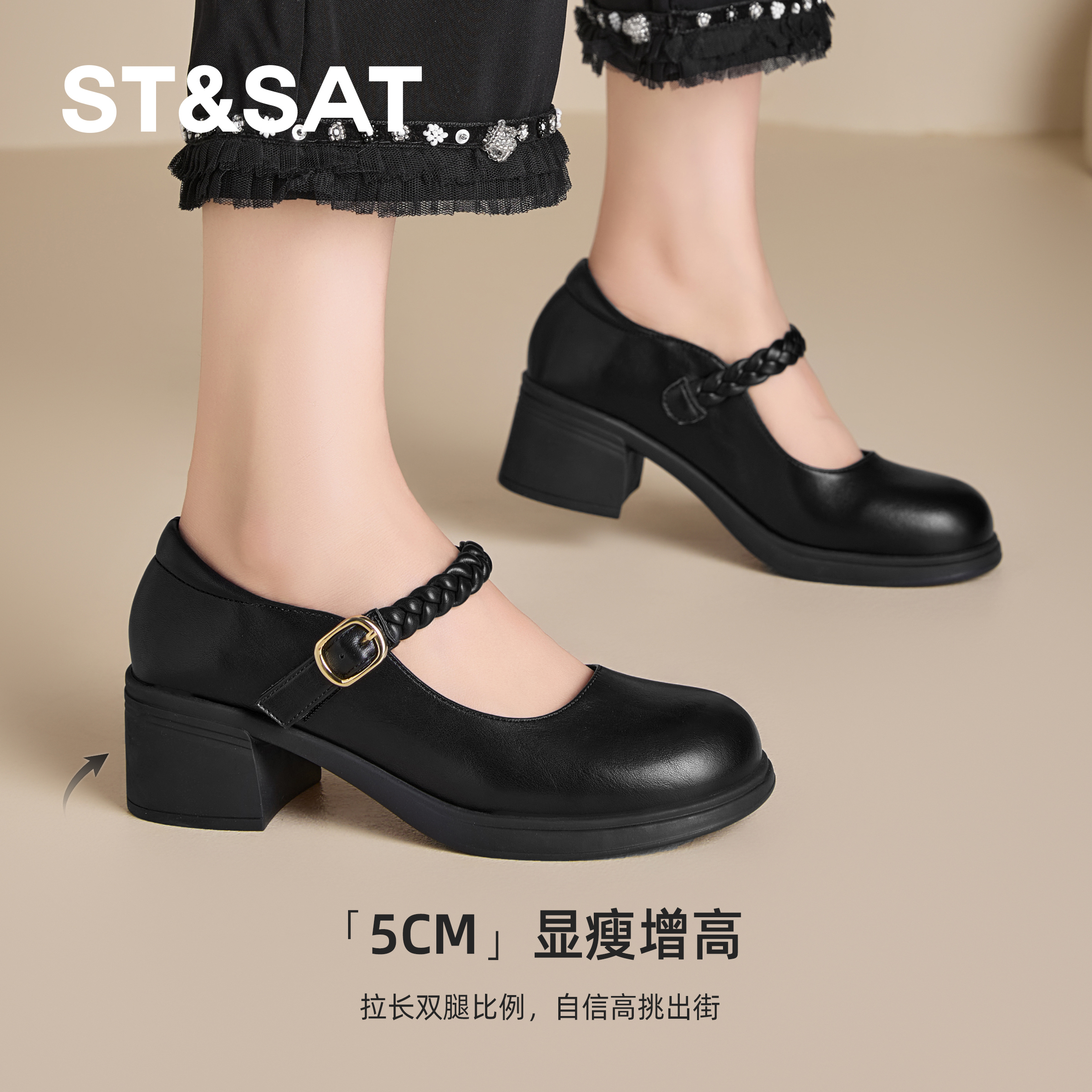 瓢鞋 方扣红色单鞋 百思图25秋新款 粗跟浅口女平底婚鞋 丝绒玫瑰