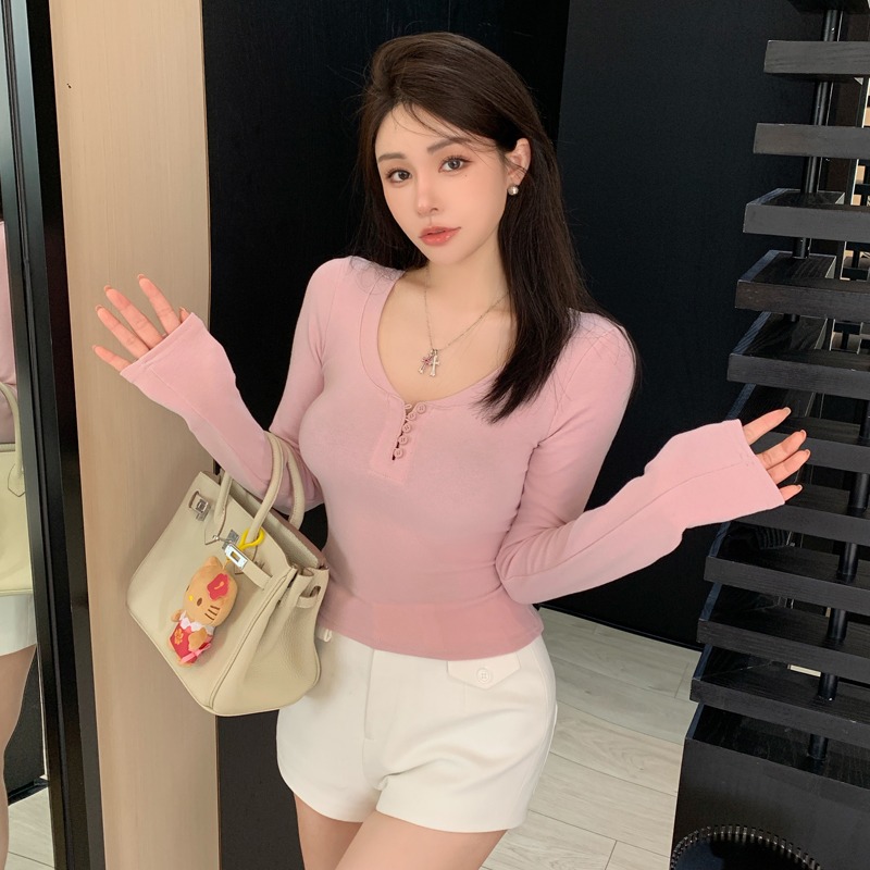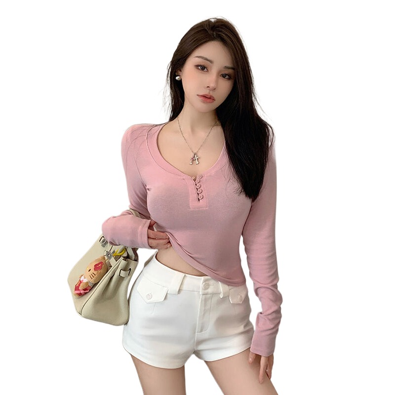 U领纽扣纯棉打底衫 T恤女早春新款 上衣 显身材长袖 纯欲温柔风修身