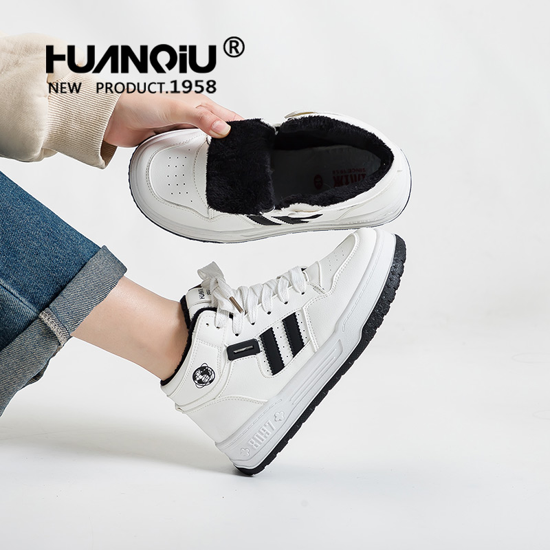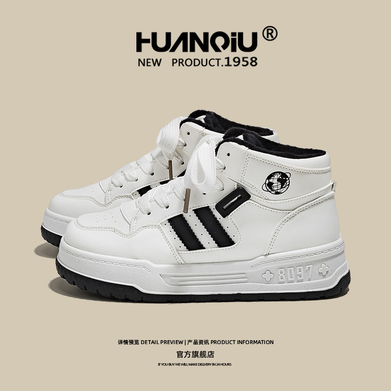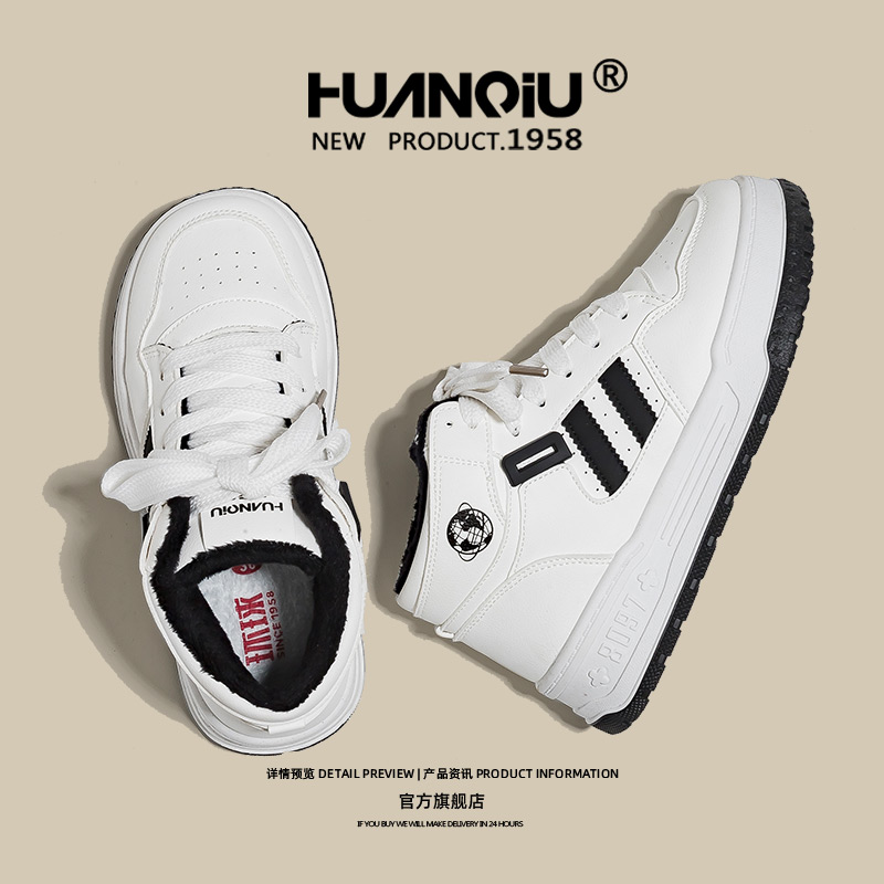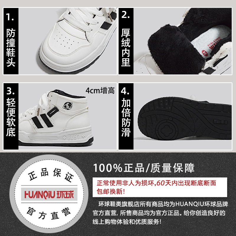 百搭厚底保暖棉鞋 环球经典 高帮板鞋 女2024冬季 黑白加绒加厚小白鞋