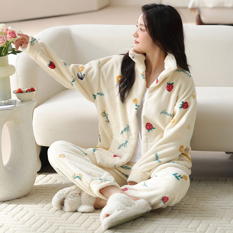 猫人法兰绒保暖套装 女加绒加厚秋冬保暖睡衣立领甜美风家居服套装