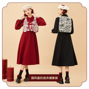 新款 紫涵新中式 女秋季 连衣裙两件套装 a字裙 盘扣马甲背心收腰衬衫
