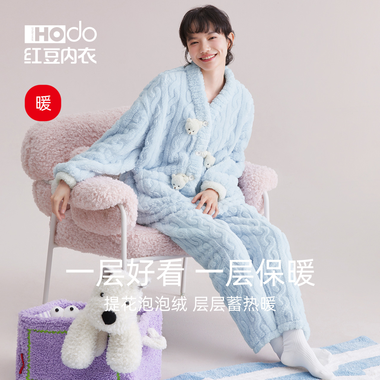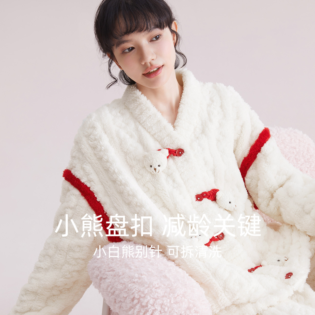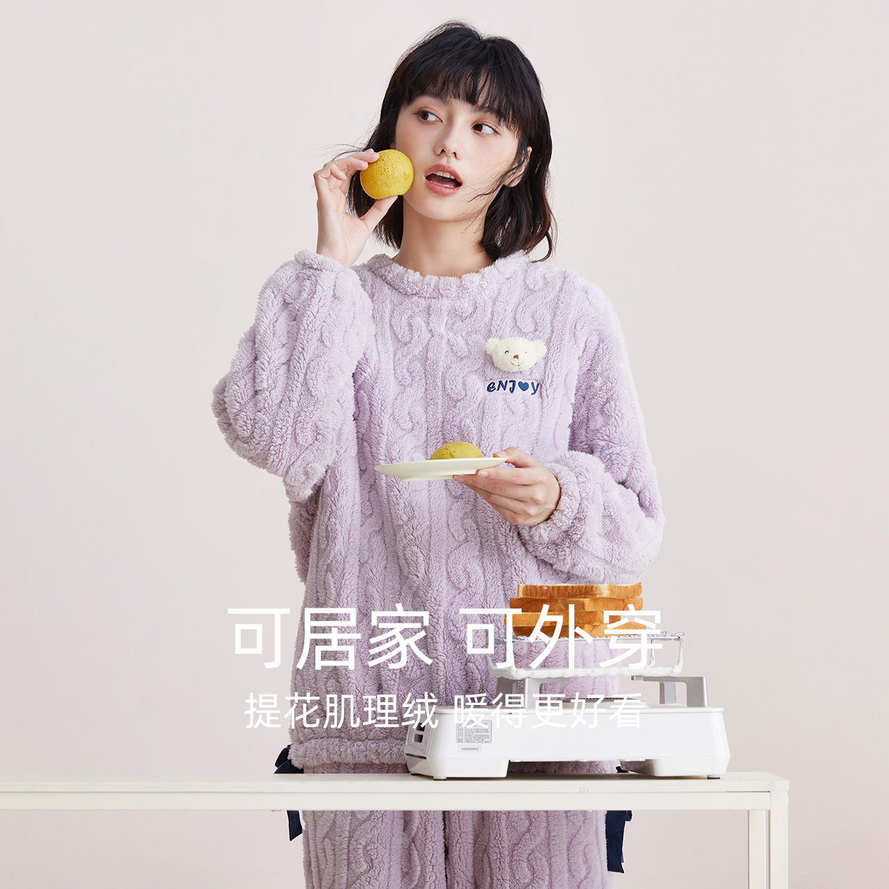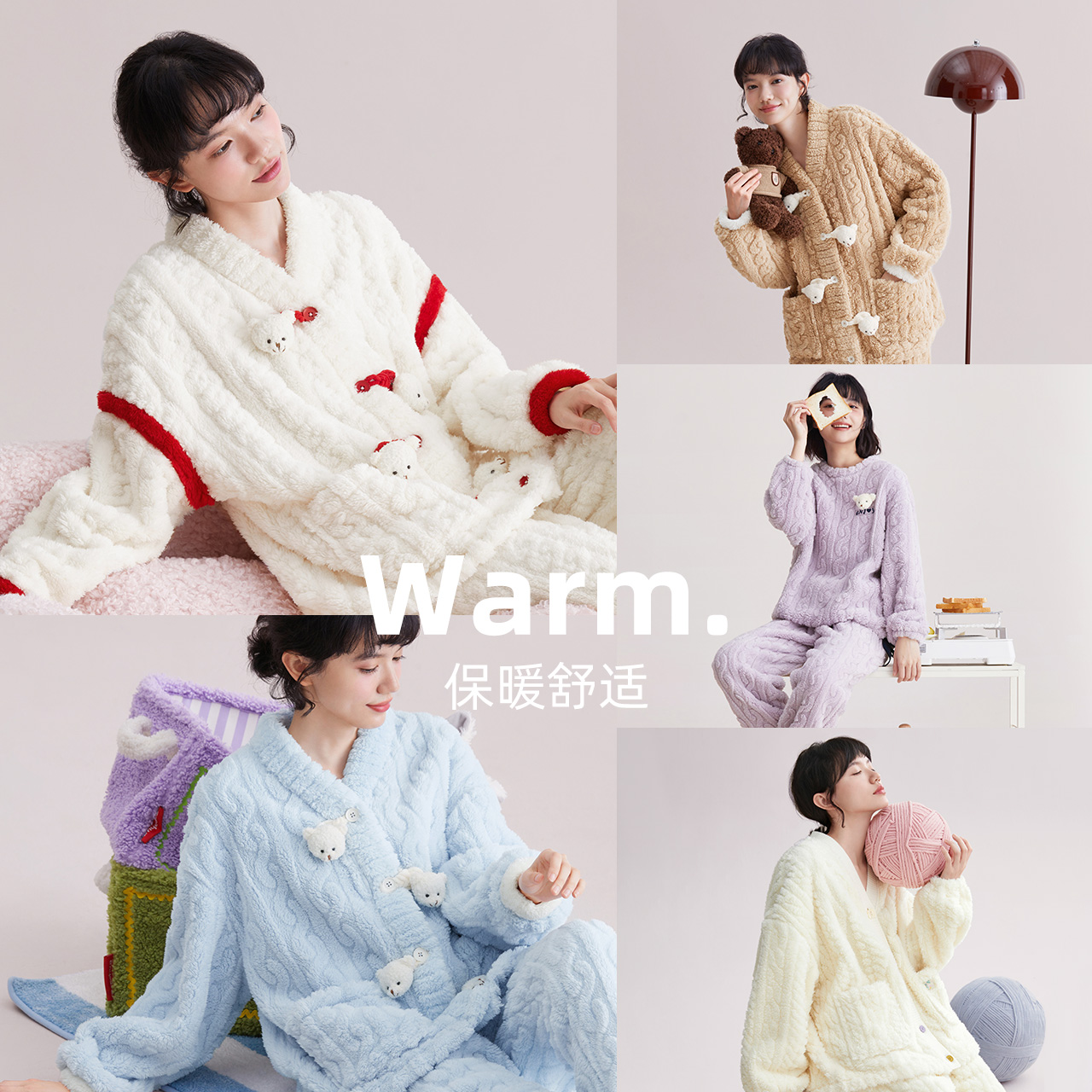 秋冬2025新款 加厚加绒冬天珊瑚绒家居服套装 女款 半边绒女睡衣冬季