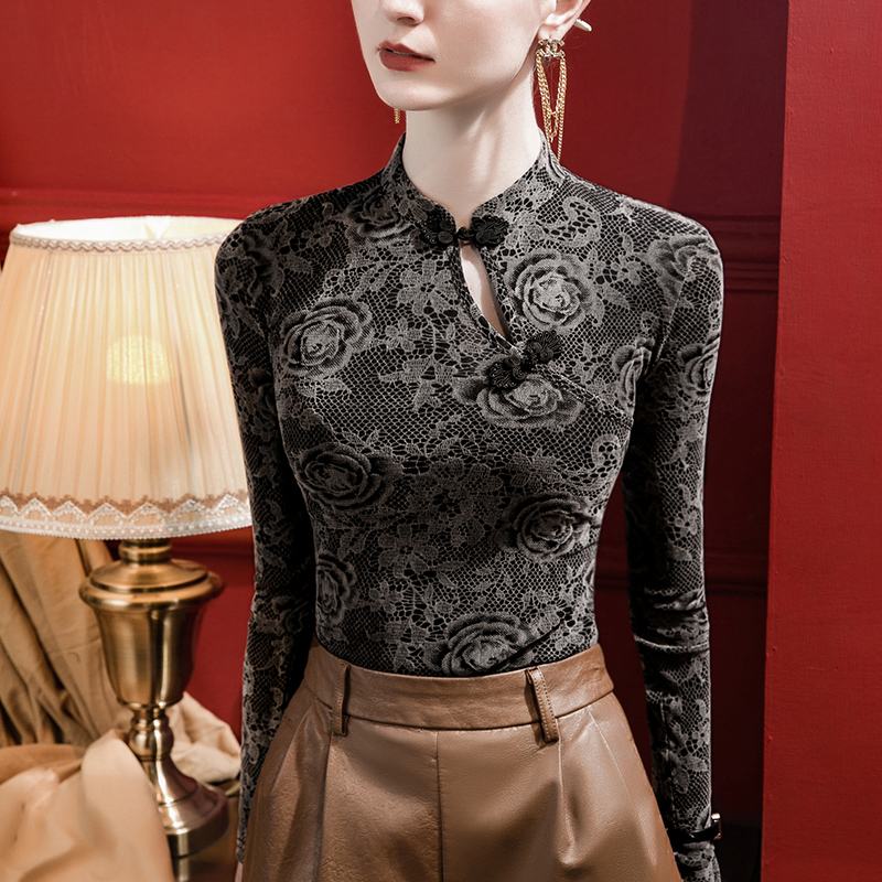 打底衫 2025秋季 淑女长袖 盘扣旗袍领植绒蕾丝复古上衣女修身 新款