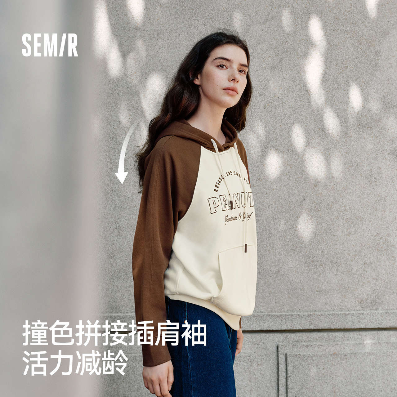 复古 连帽秋oversize刺绣字母上衣美式 森马卫衣女中长款 撞色插肩袖