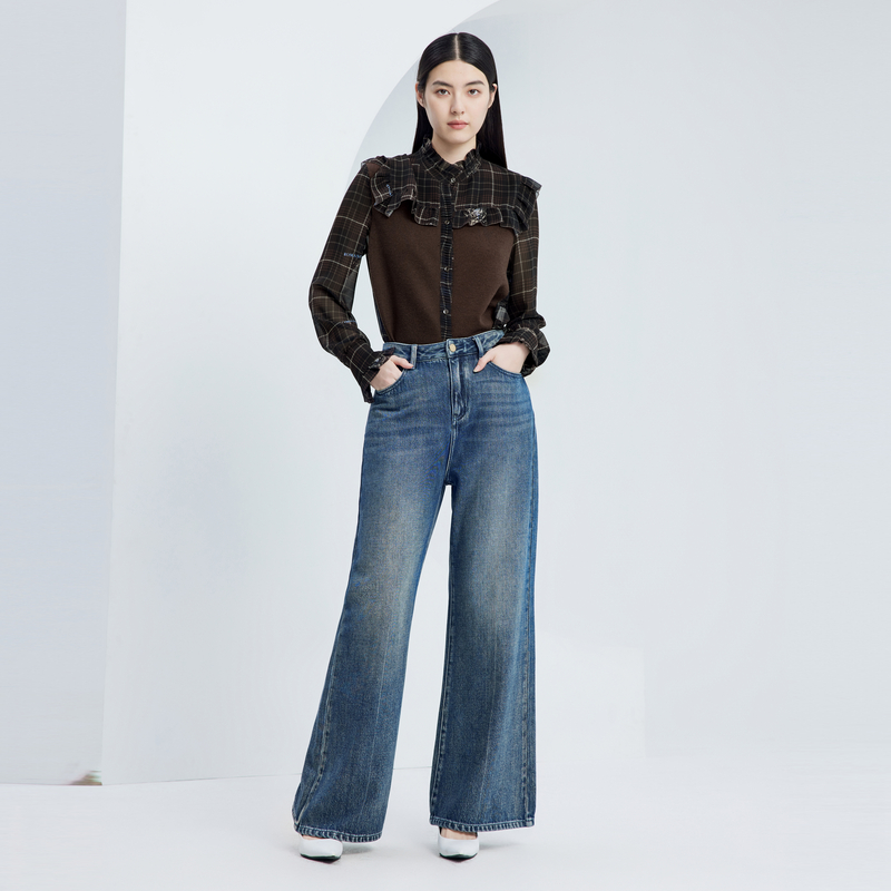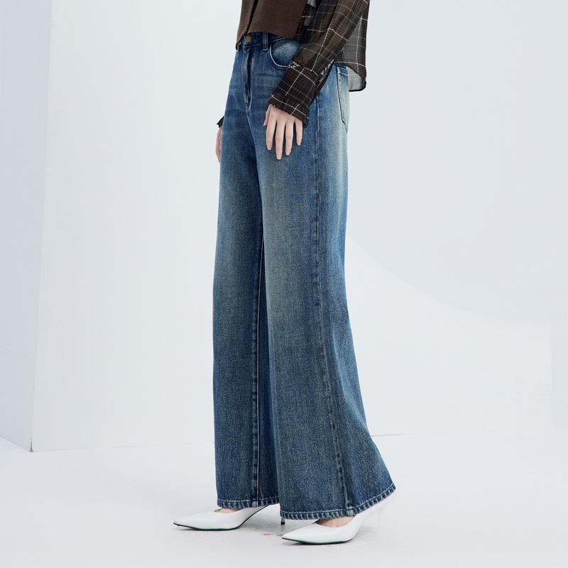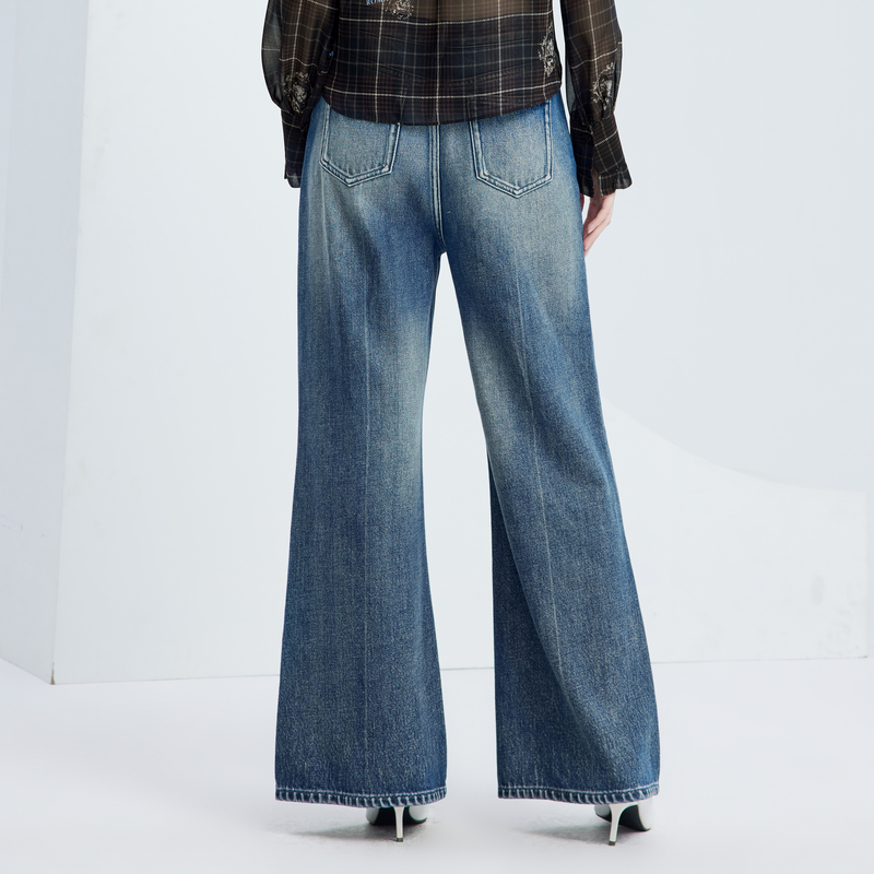 女装 XG雪歌蓝色水洗设计纯棉牛仔裤 通勤简约微喇长裤 新款 2025秋季