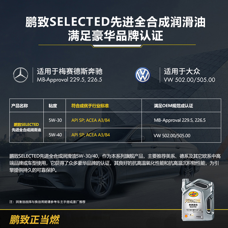 SP正品 壳牌鹏致Selected 认证 银标全合成润滑油汽车机油5W