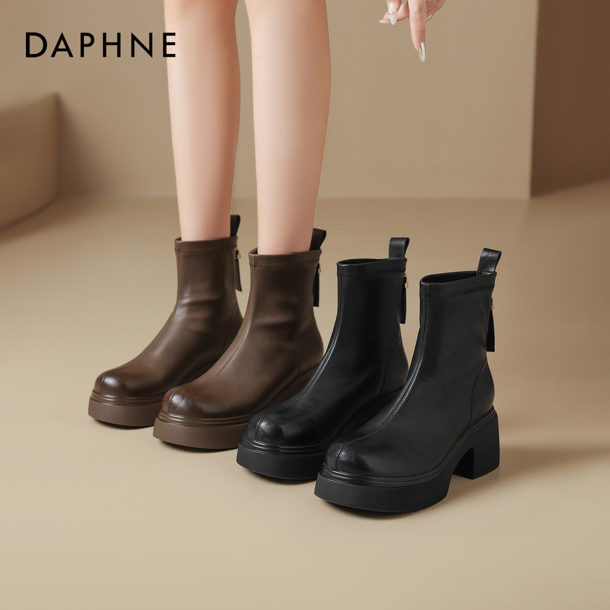 厚底马丁靴 女鞋 达芙妮高跟短靴女2025新款 秋冬加绒瘦瘦靴子女冬季