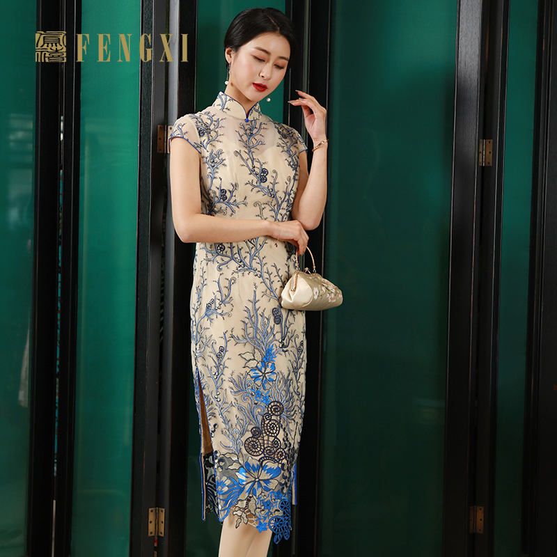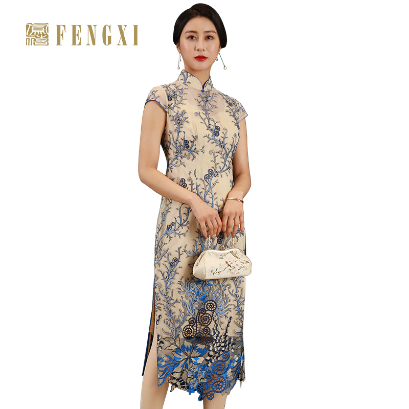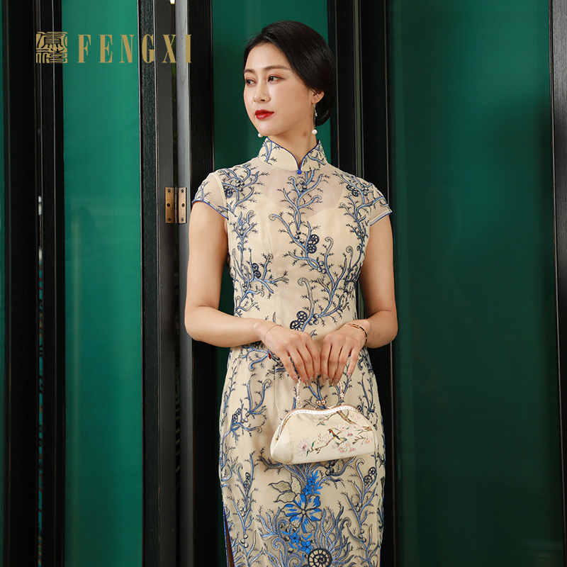 菲梦伊原创钉珠提花连衣裙女秋季 国风高端气质贵妇旗袍裙子 新中式
