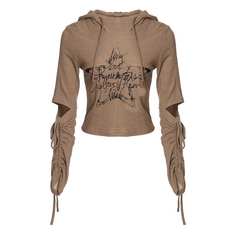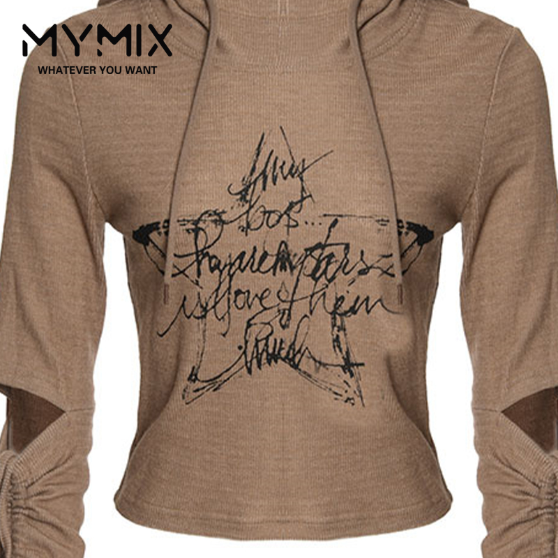 组合2024冬季 短款 新款 连帽星星字母棕色长袖 T恤 女装 MYMIX我