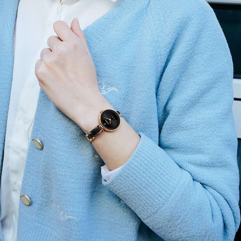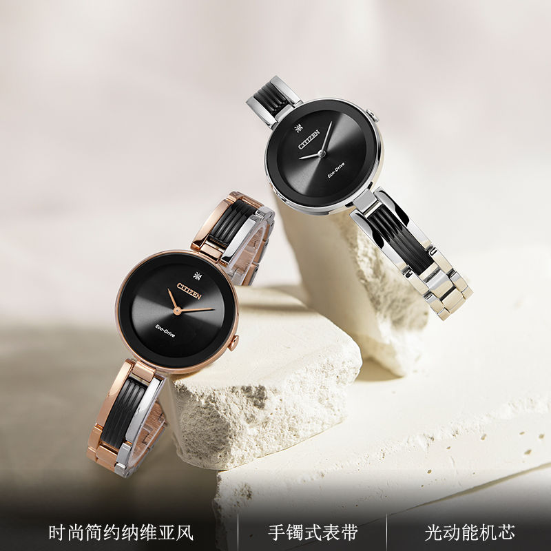 时尚 西铁城手表女 简约黑金色钻石镶嵌光动能女表EX1536 自营