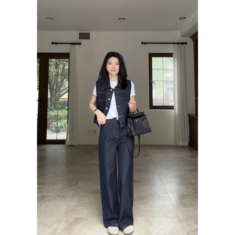 郭九九呢郭九九呢棉质复古风宽松牛仔马甲外套高腰阔腿裤 百搭长裤