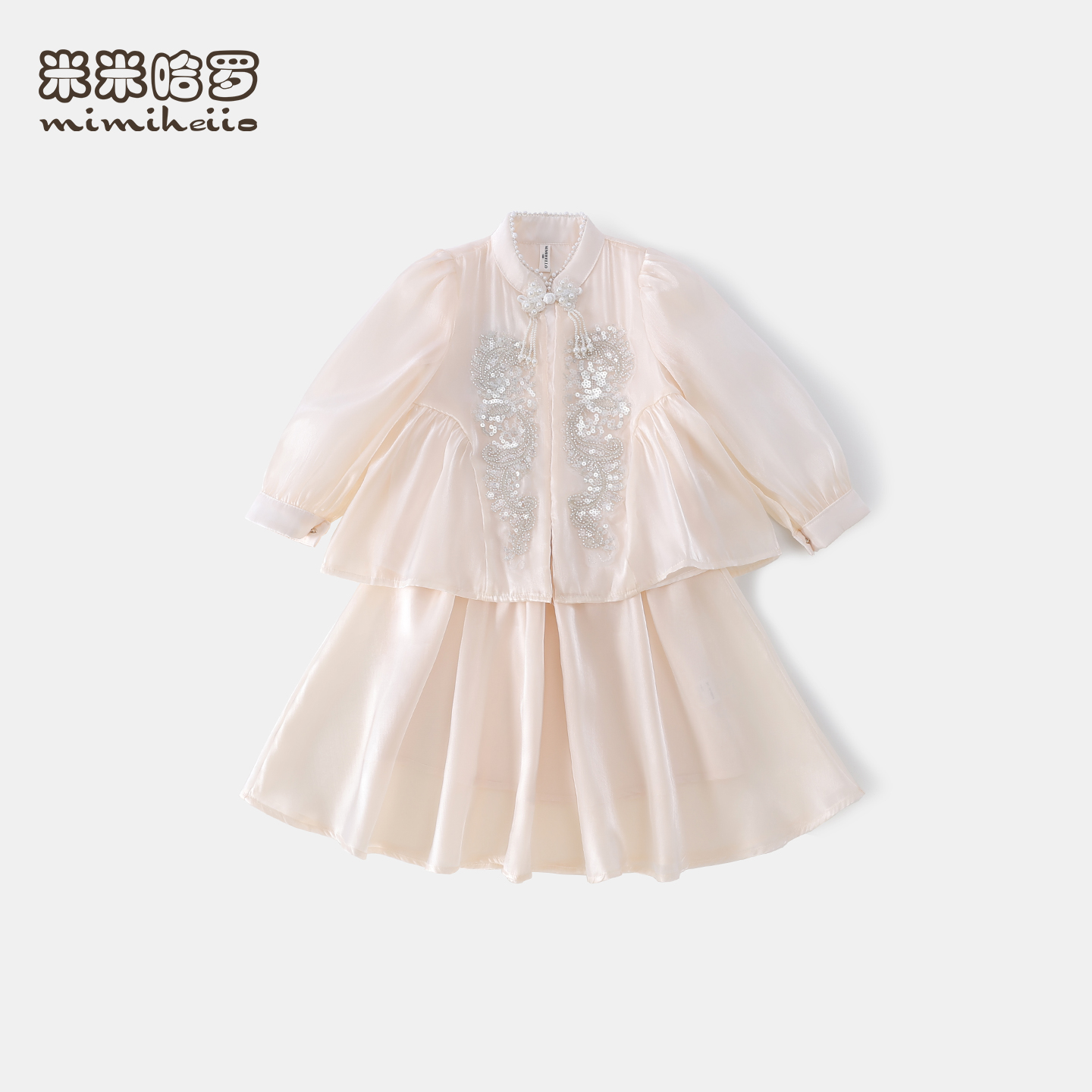 子套装 叠穿刺绣牛仔马甲阔腿裤 女早秋新款 杏色娃娃领镂空蕾丝衬衫