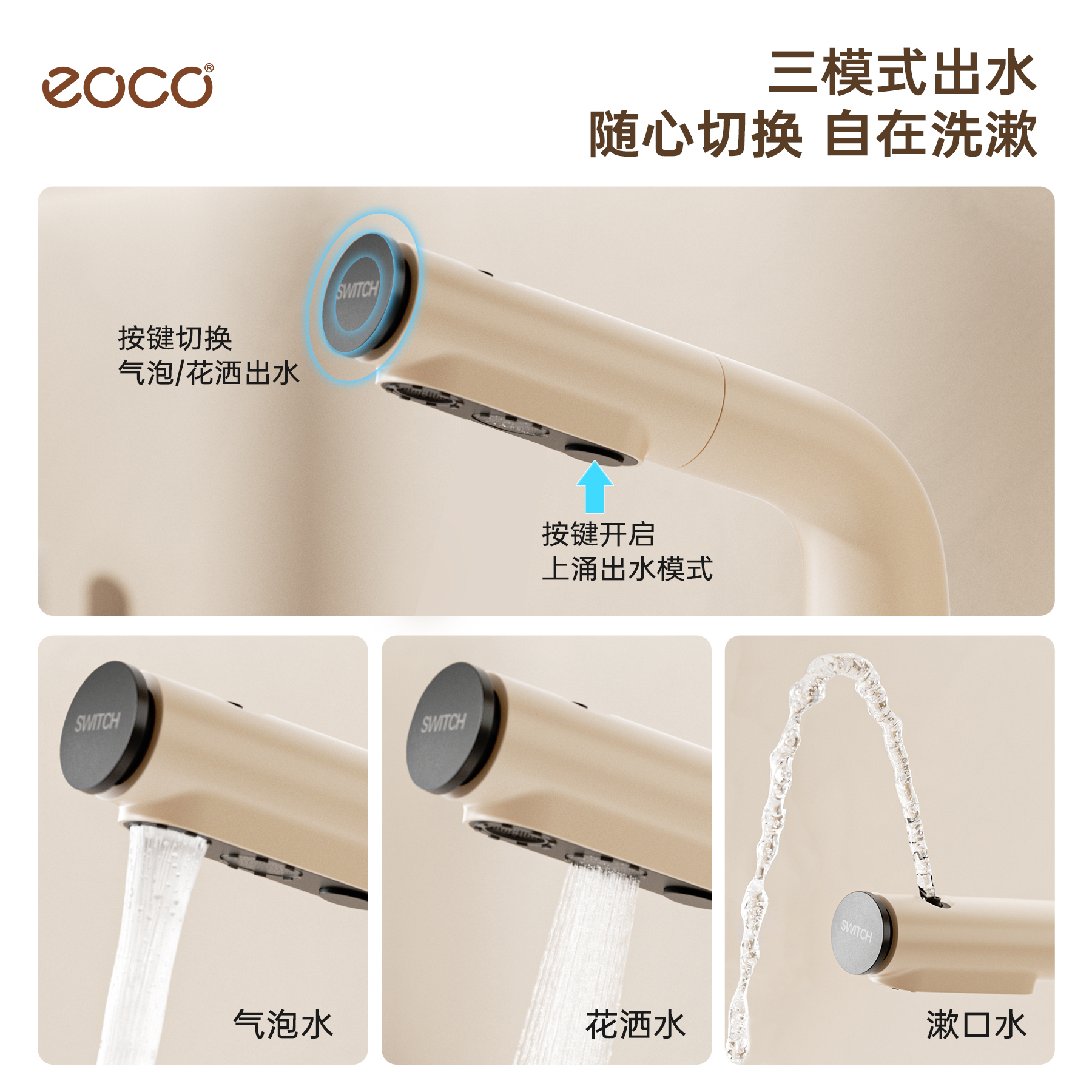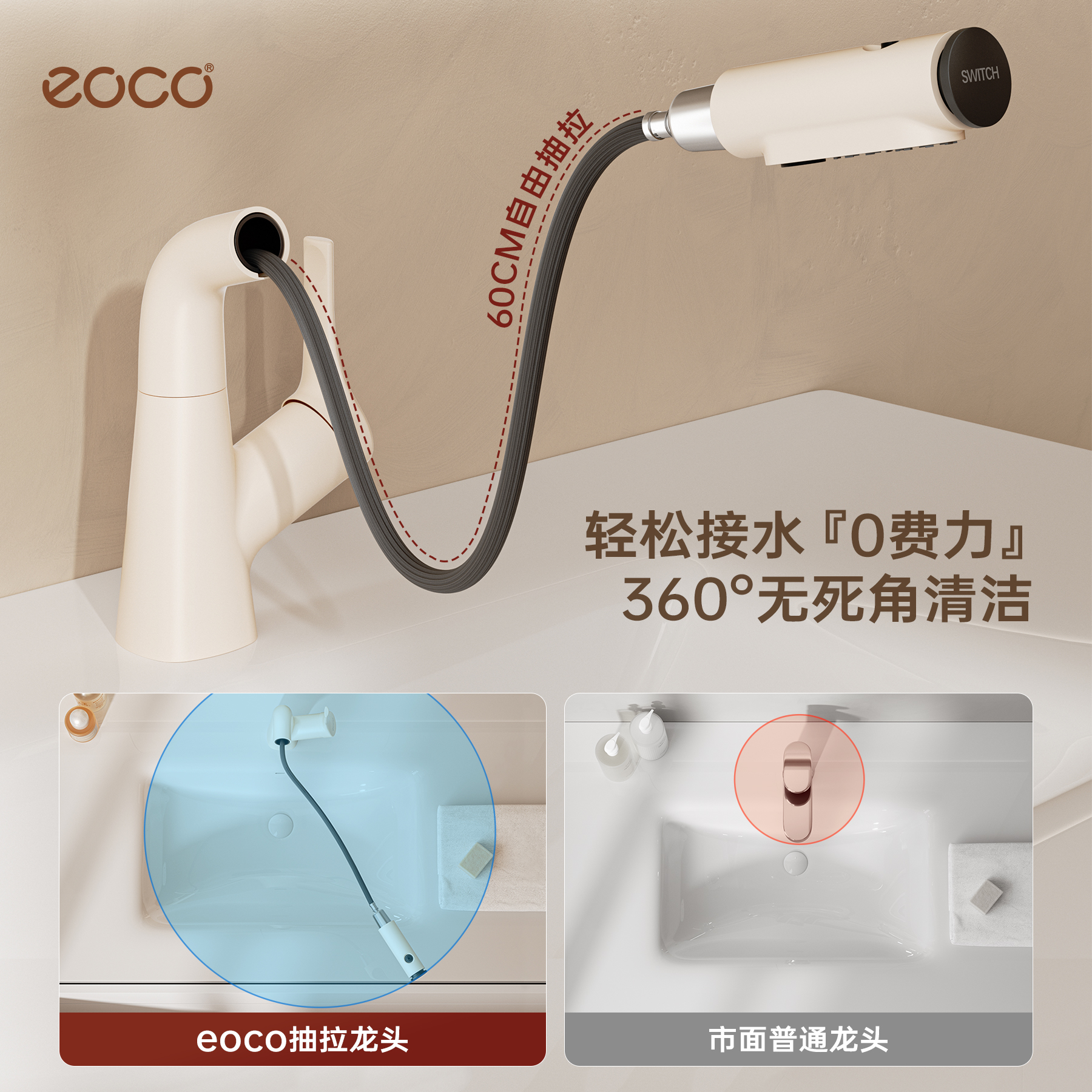 eoco浴室洗面盆水龙头卫生间洗手台盆抽拉式 洗漱台龙头奶油风M18