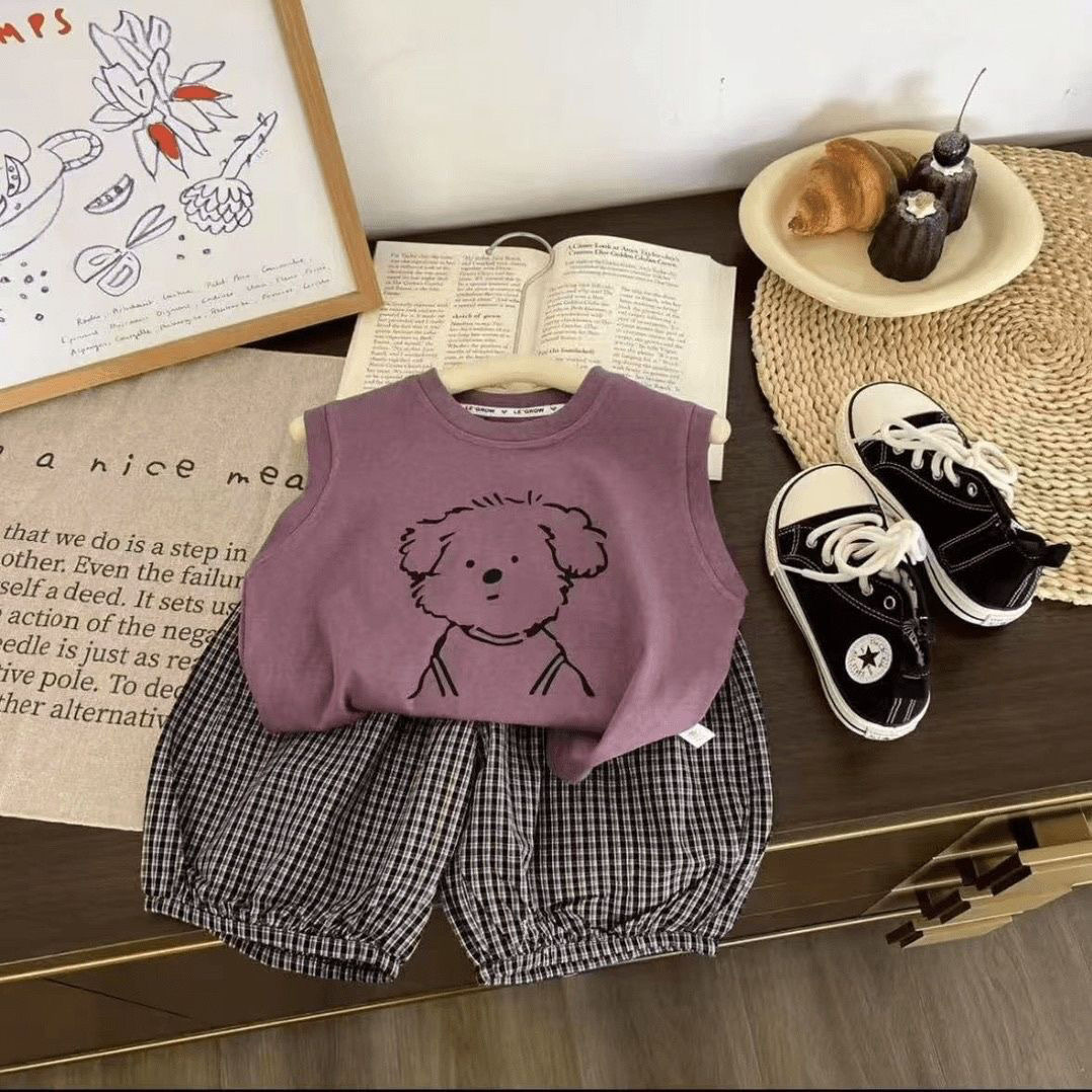 男童卡通小狗背心洋气格子七分裤 2025新款 两件套 背心套装 儿童夏季