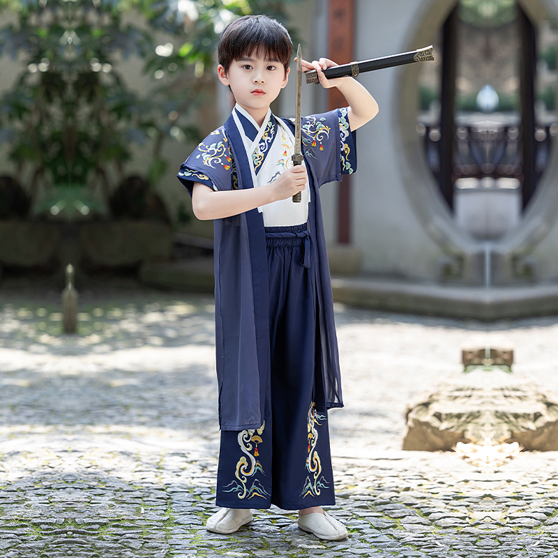侠客帅气刺绣公子古风国学少爷唐装 儿童古装 演出 新款 汉服男童短袖