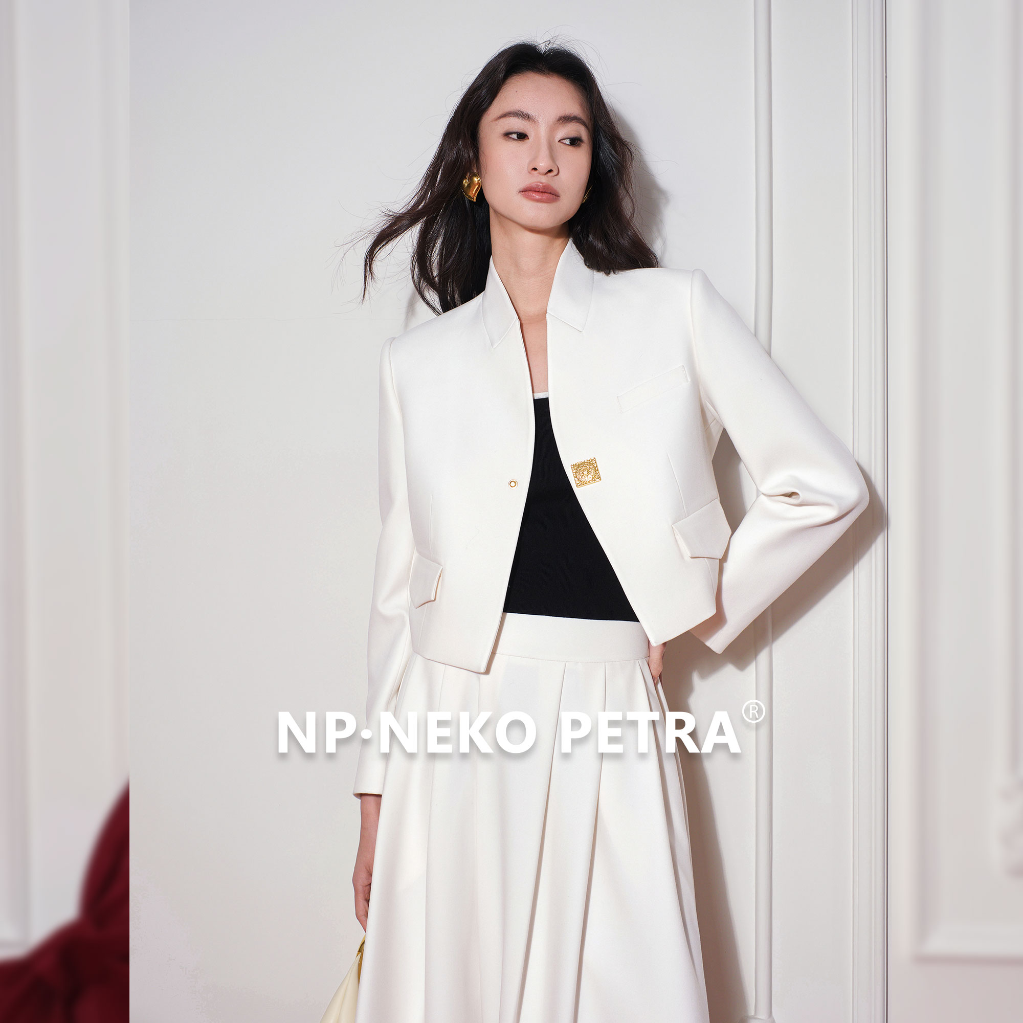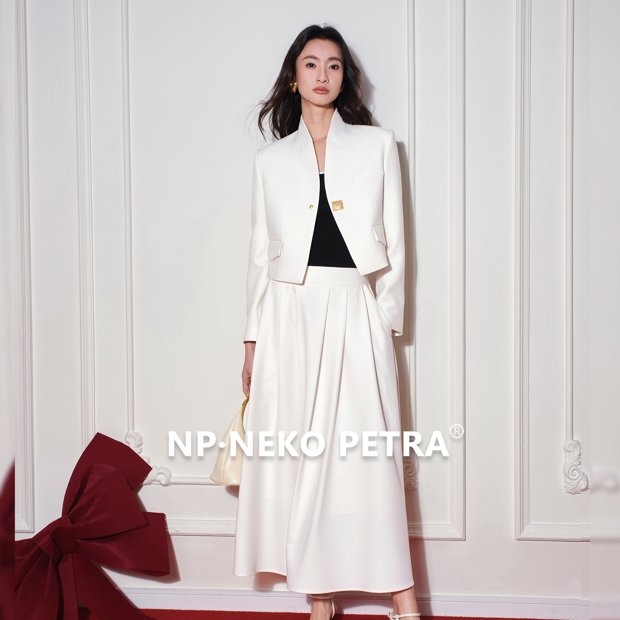 女春秋长款 套装 大摆半裙两件套 高级感V领白色小西装 限时清仓特卖