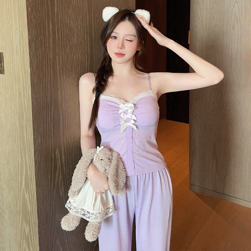 薄款 2025新款 短袖 套装 可外穿家居服 长裤 猫人纯棉带胸垫睡衣女夏季
